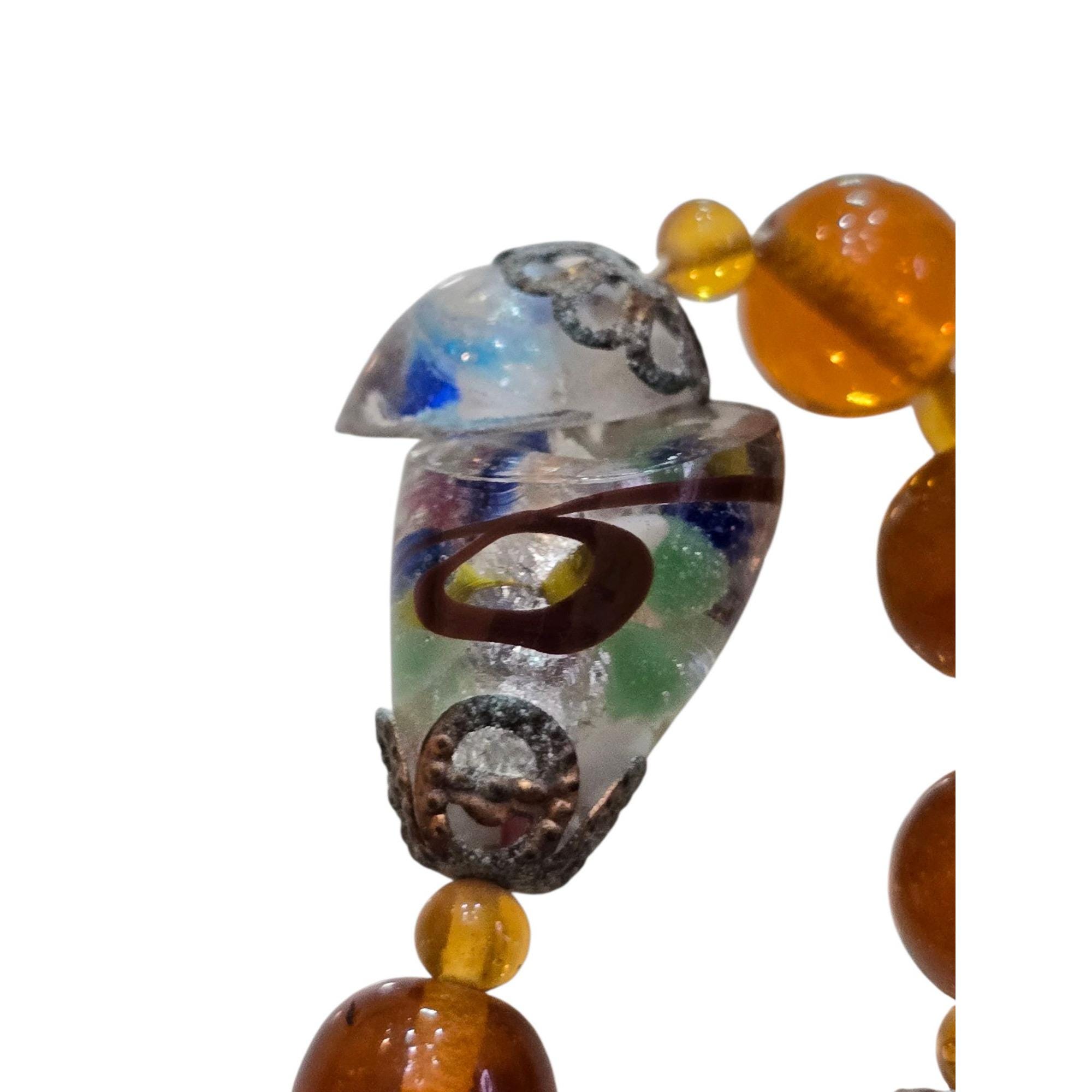 Details: This is an early one, possibly Czech-made. Push in clasp. 2 side panels are molded glass, and 1 bead is cracked. Not signed.