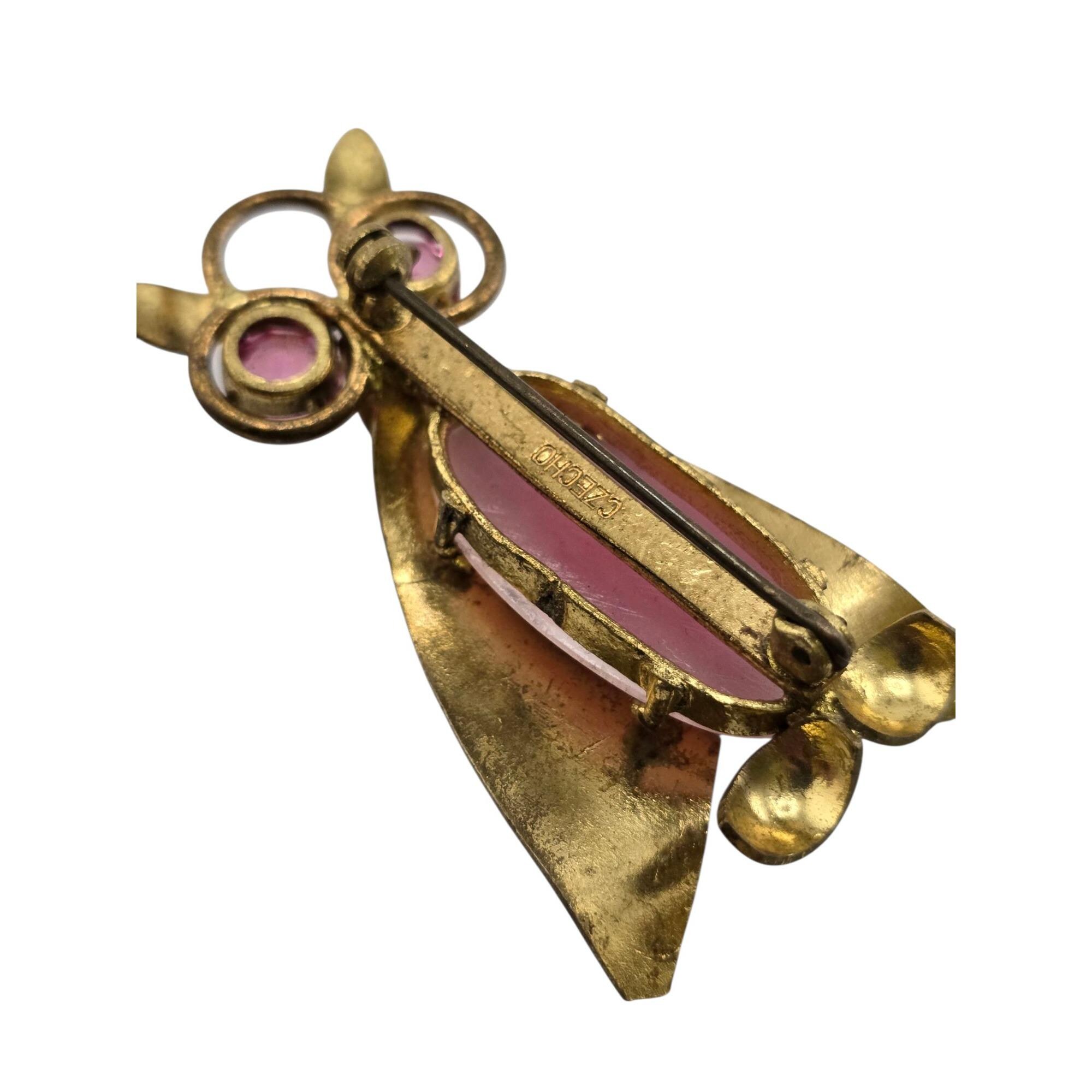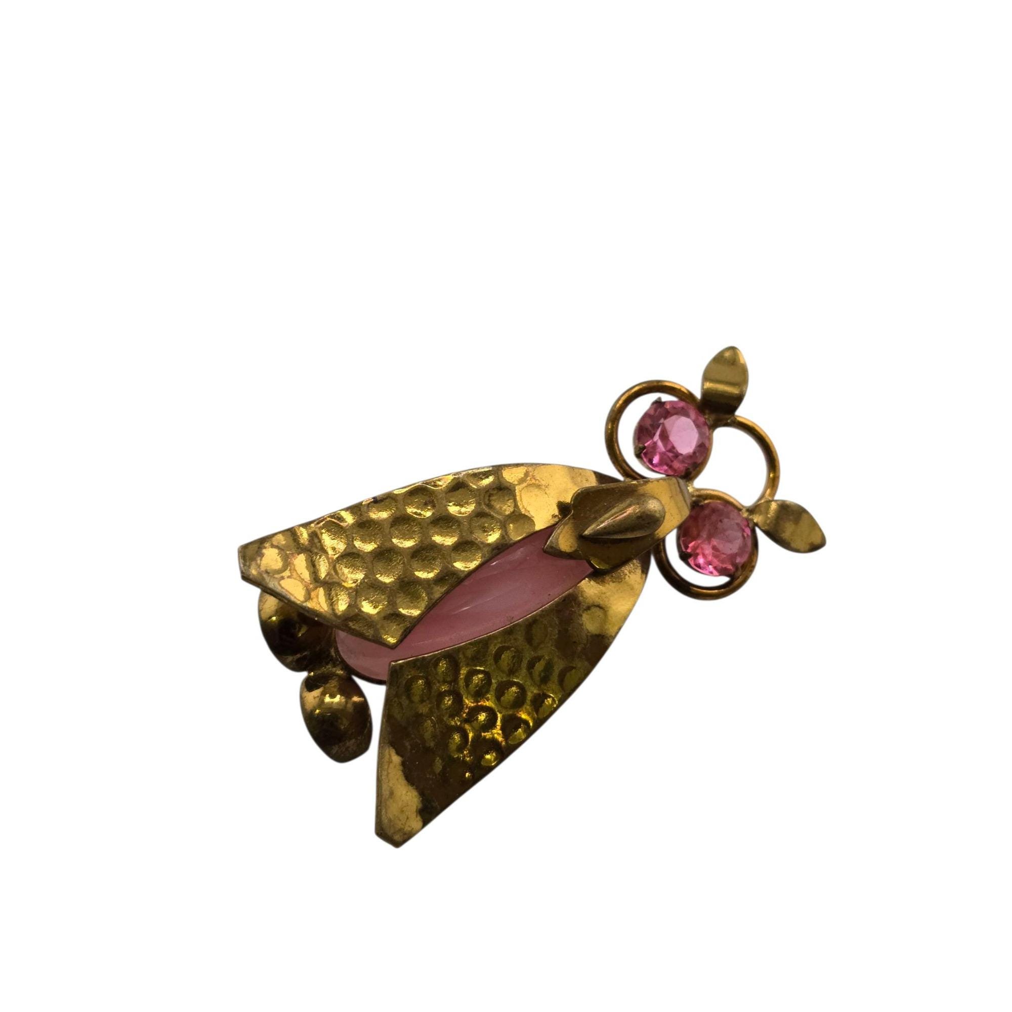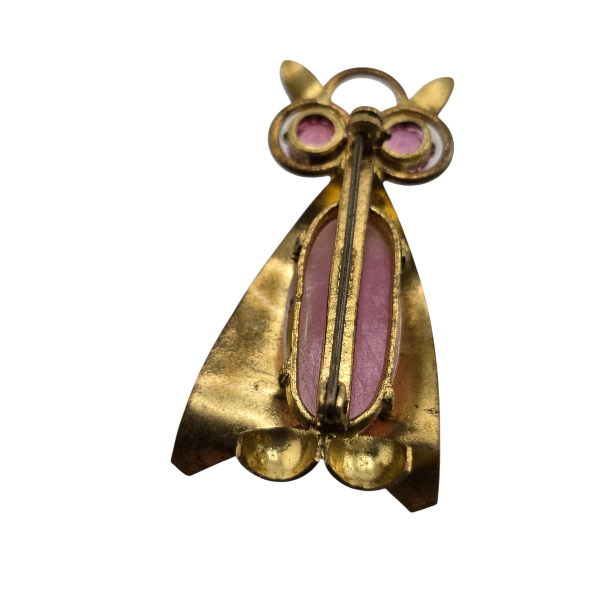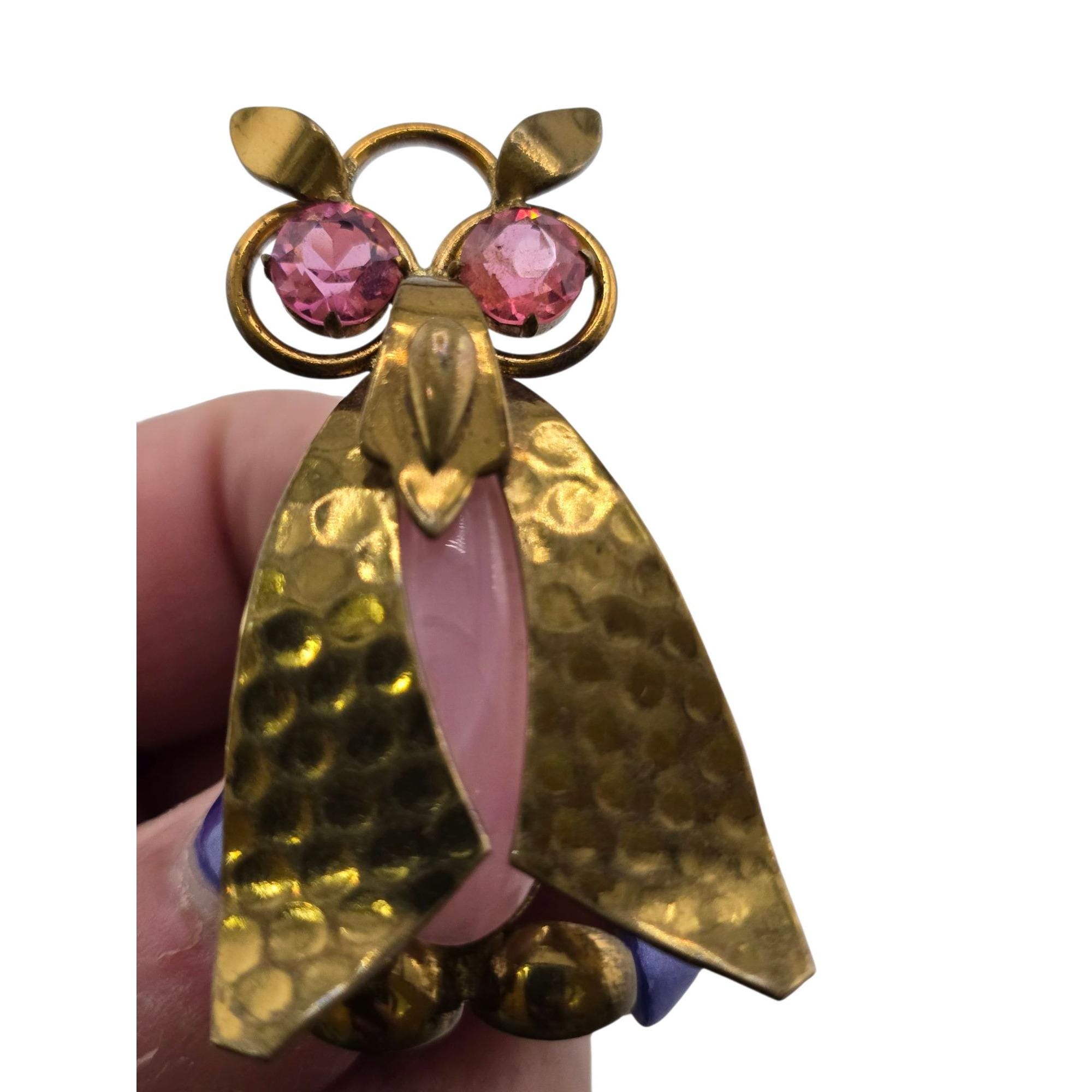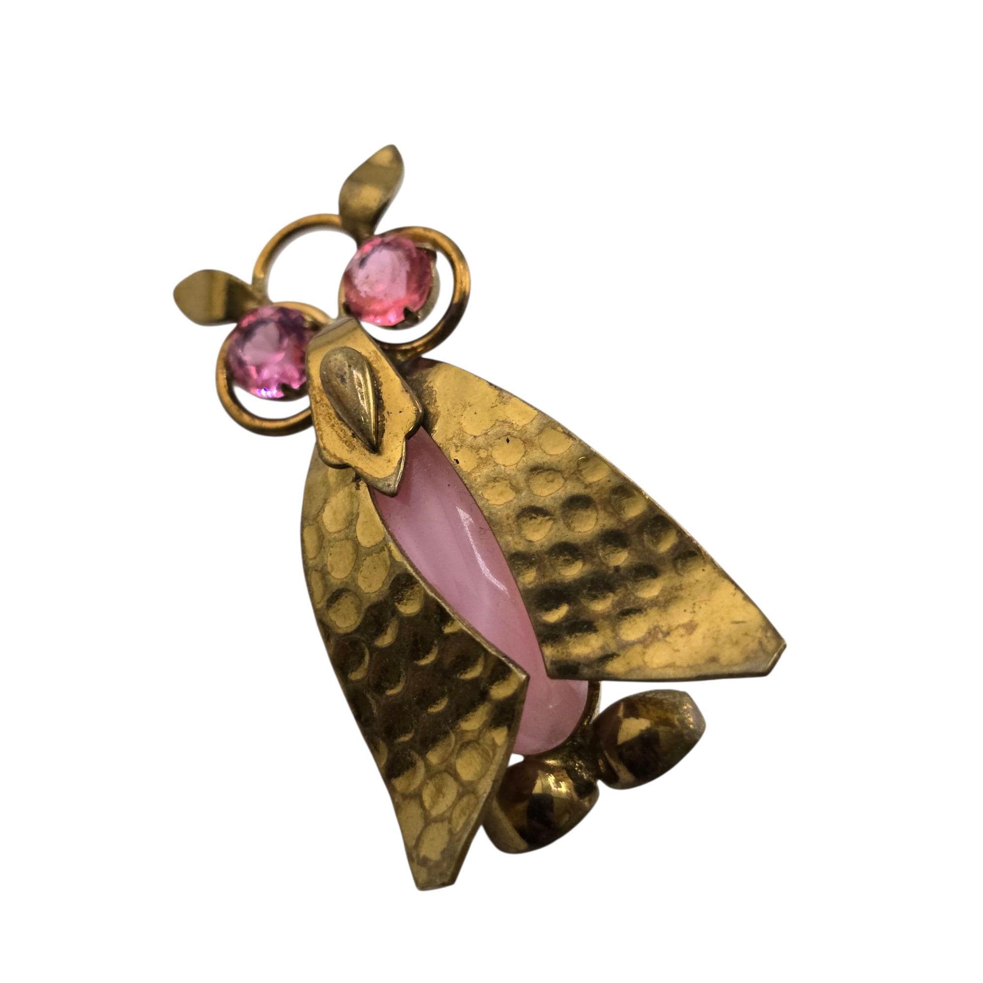Vintage Hard to Find Czecho Brass Glass & Rhinestone Owl Brooch (A9163)