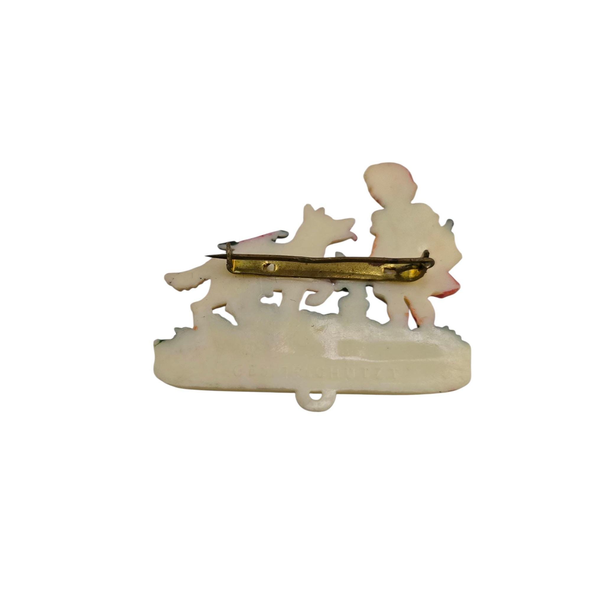 Vintage Signed Ge Geschutzt (Czechoslovakia) Schlangenbad Celluloid Boy & Dog Brooch (A9192)