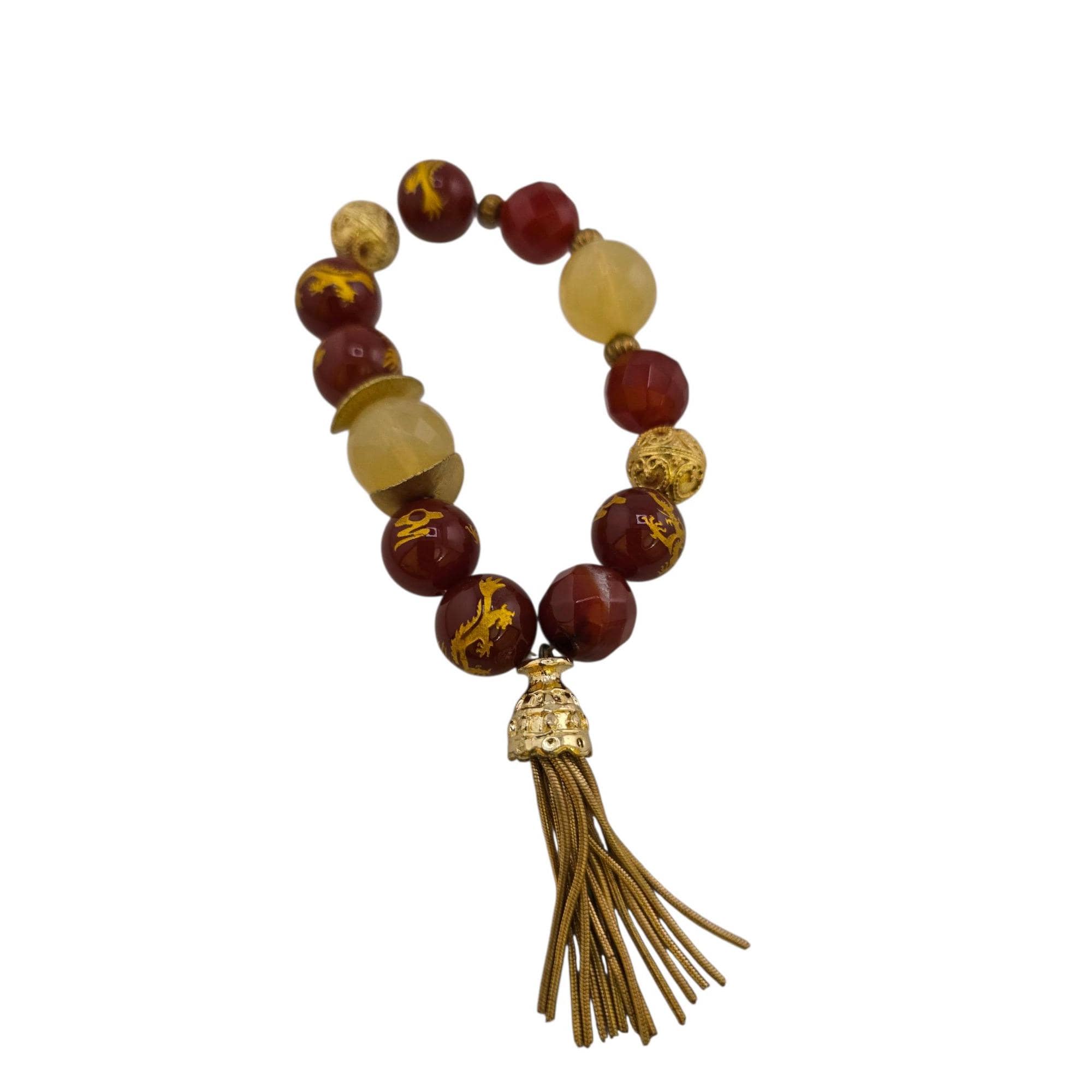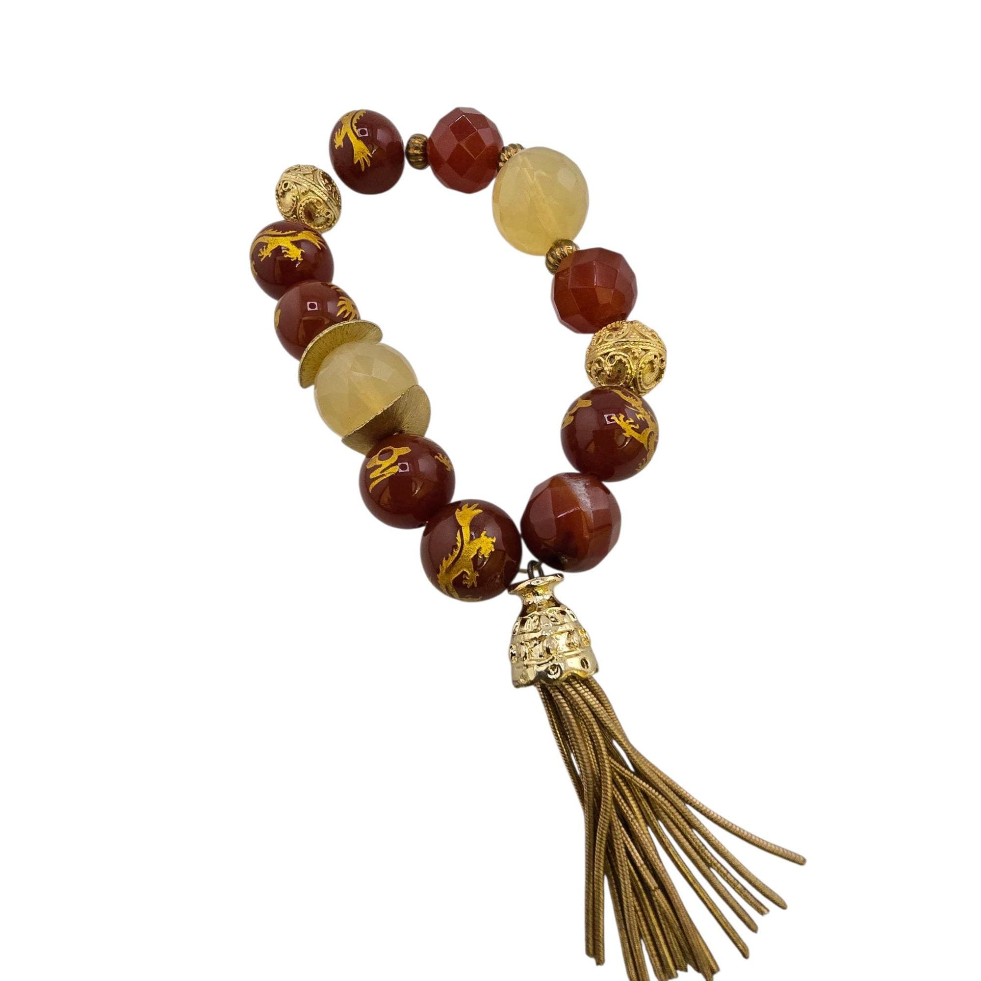 Vintage NOS Bee Charming Carnelian Dragon Beaded Stretch Bracelet with Tassel (A9216)