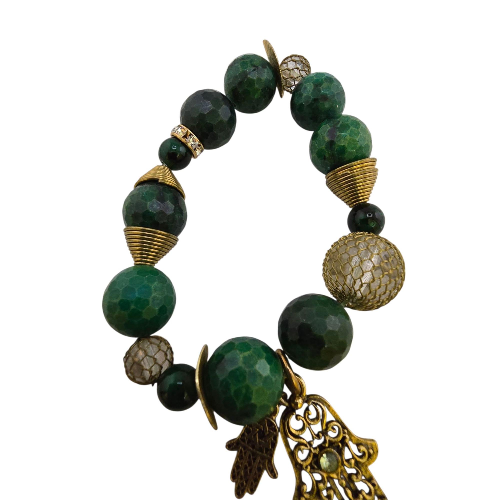 Vintage NOS Bee Charming Malachite & Hamsa Beaded Stretch Bracelet (A9218)