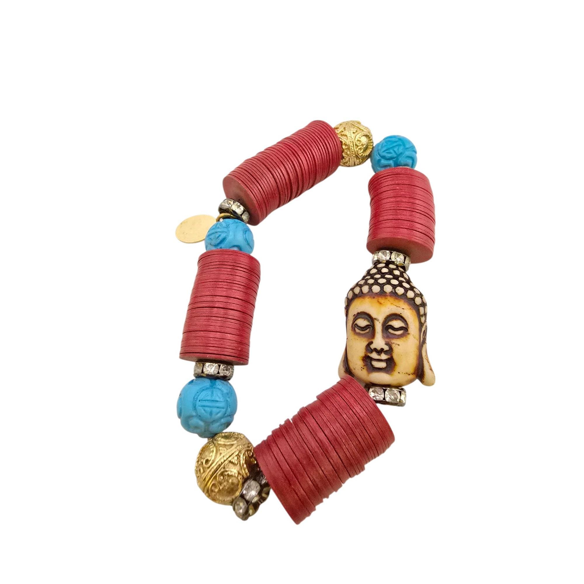 Vintage NOS Bee Charming Buddha Wood & Record Beaded Stretch Bracelet (A9224)