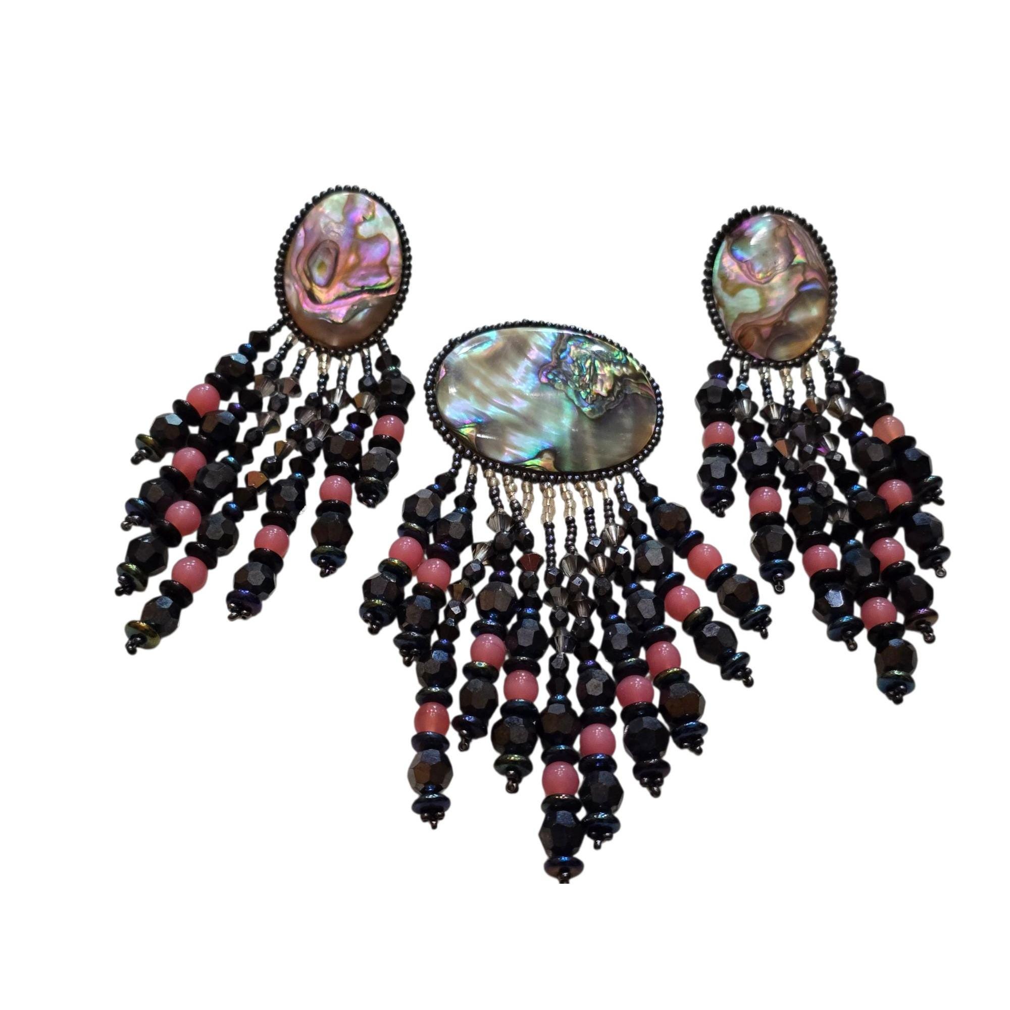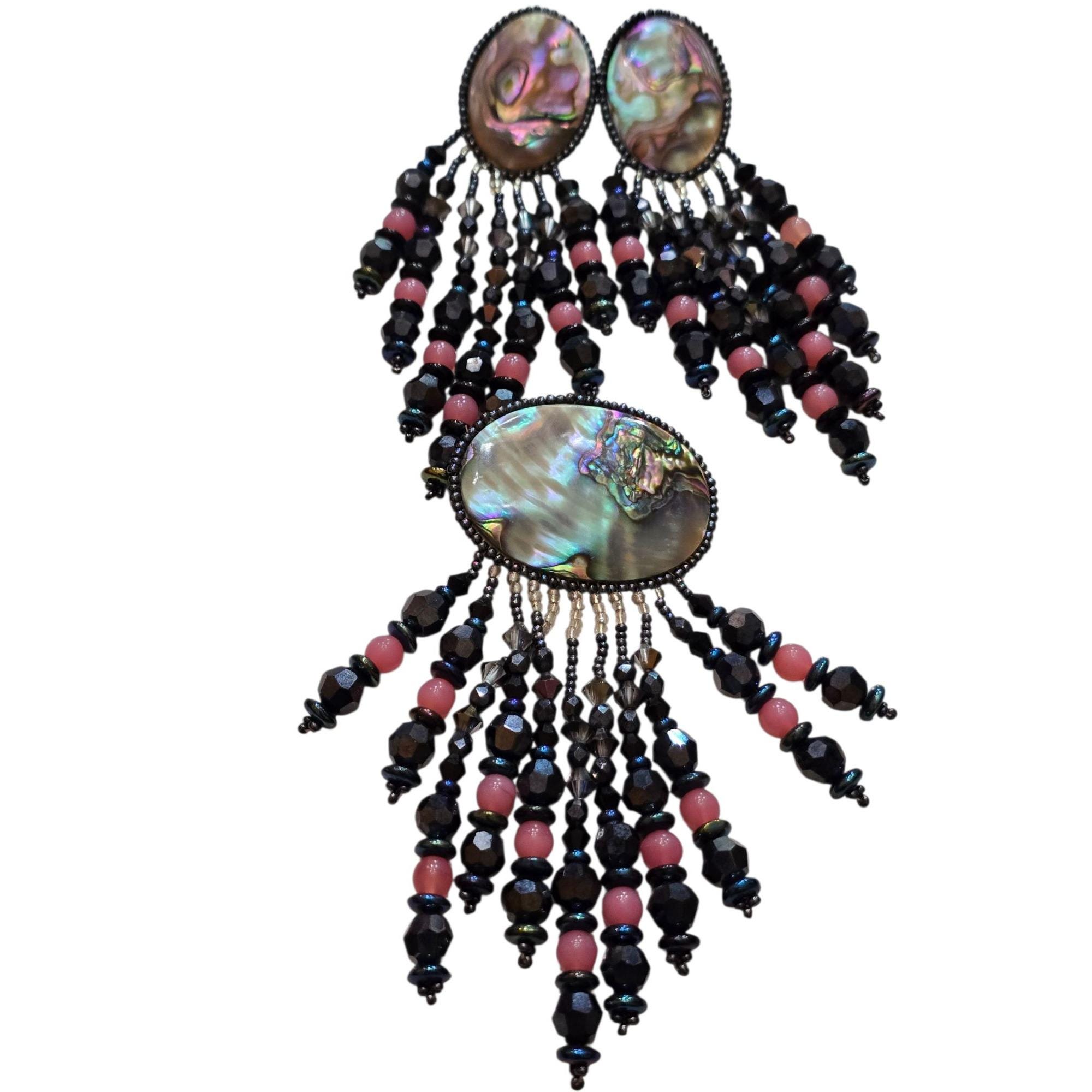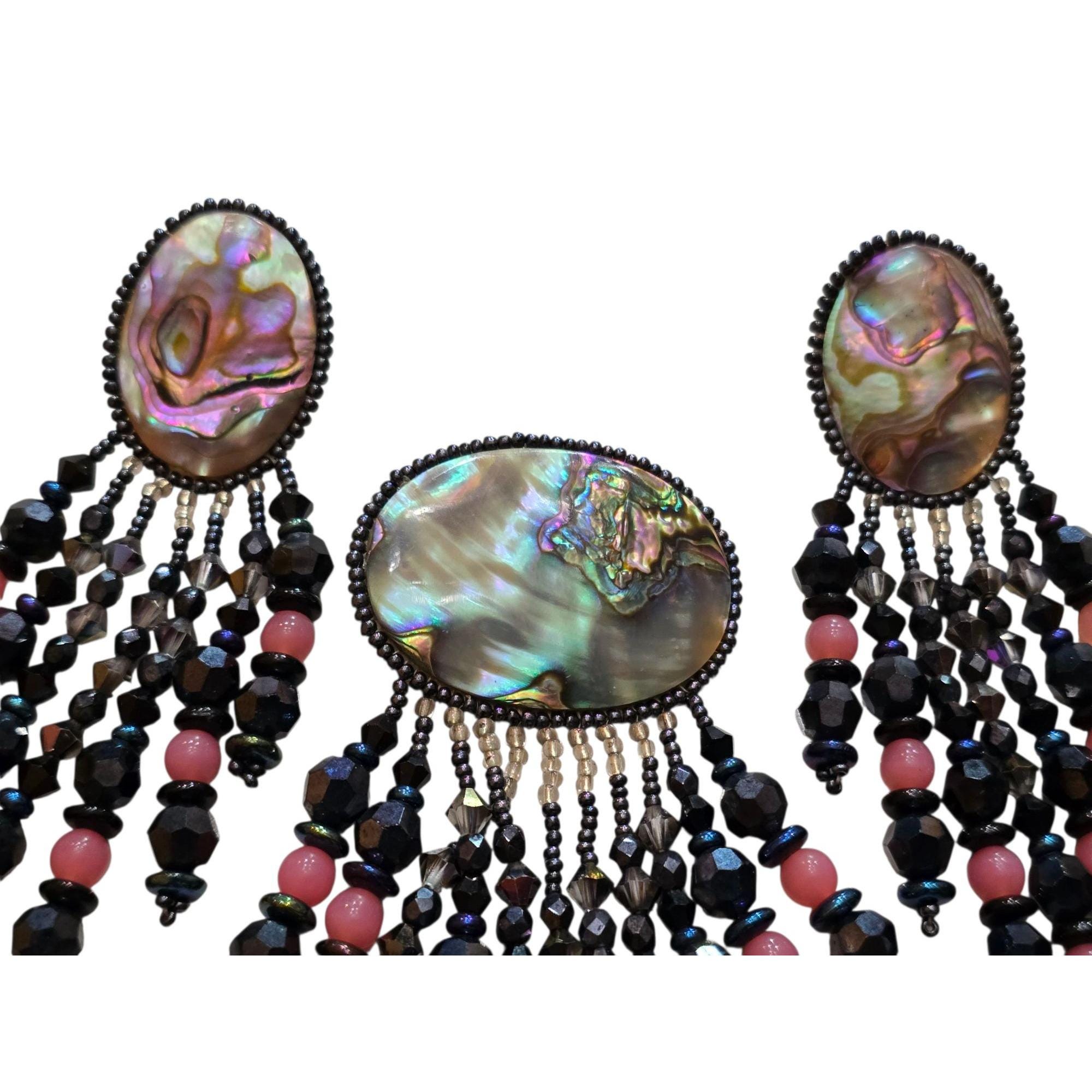 Vintage Chipita 80s Abalone Shell Crystal and Glass 3-Piece Dangling Set (A9330)