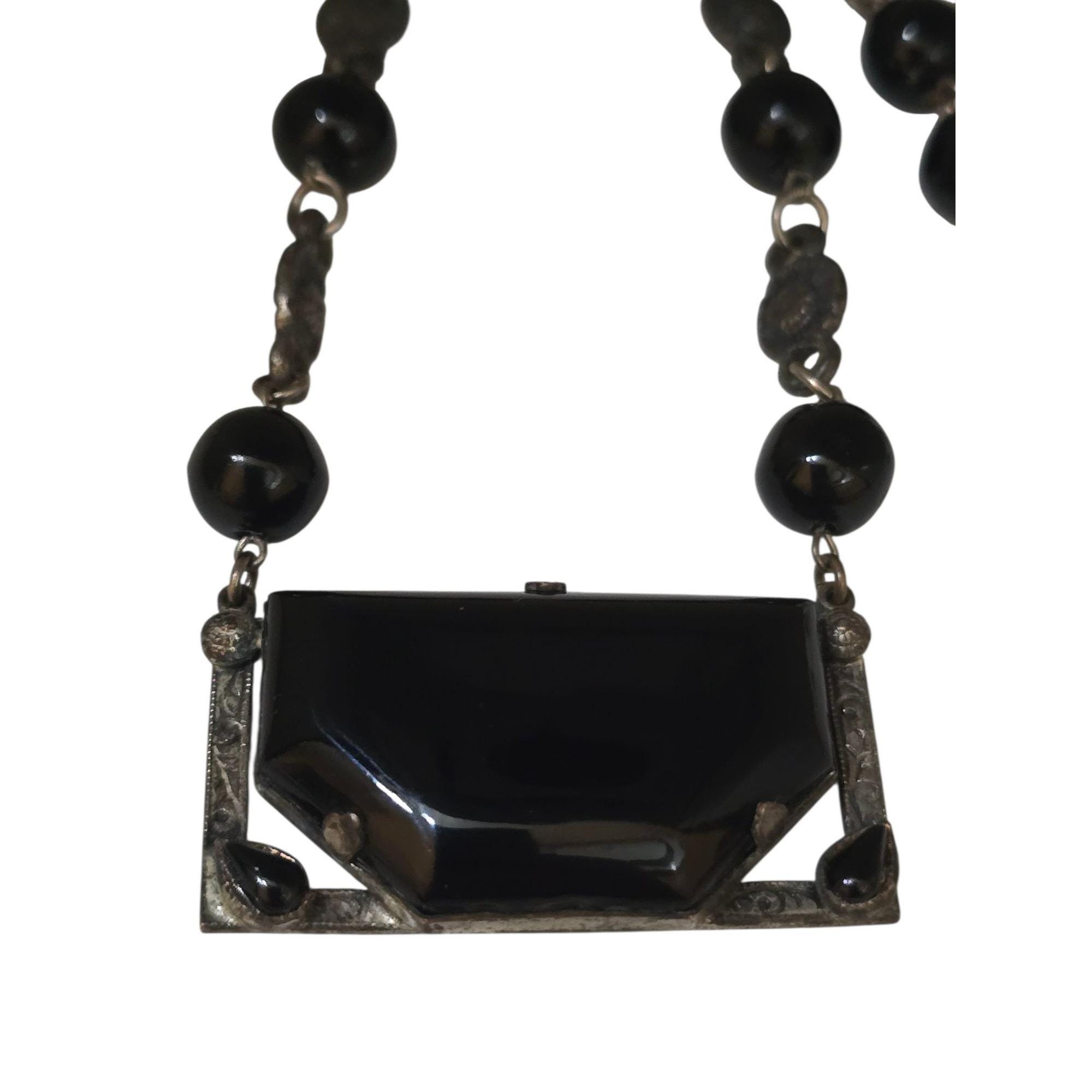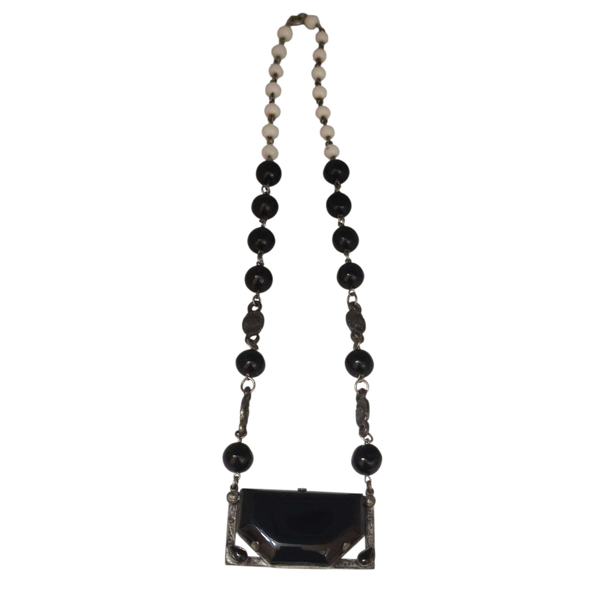Antique Unique Czech Black and White Glass Pendant Necklace (A9325)