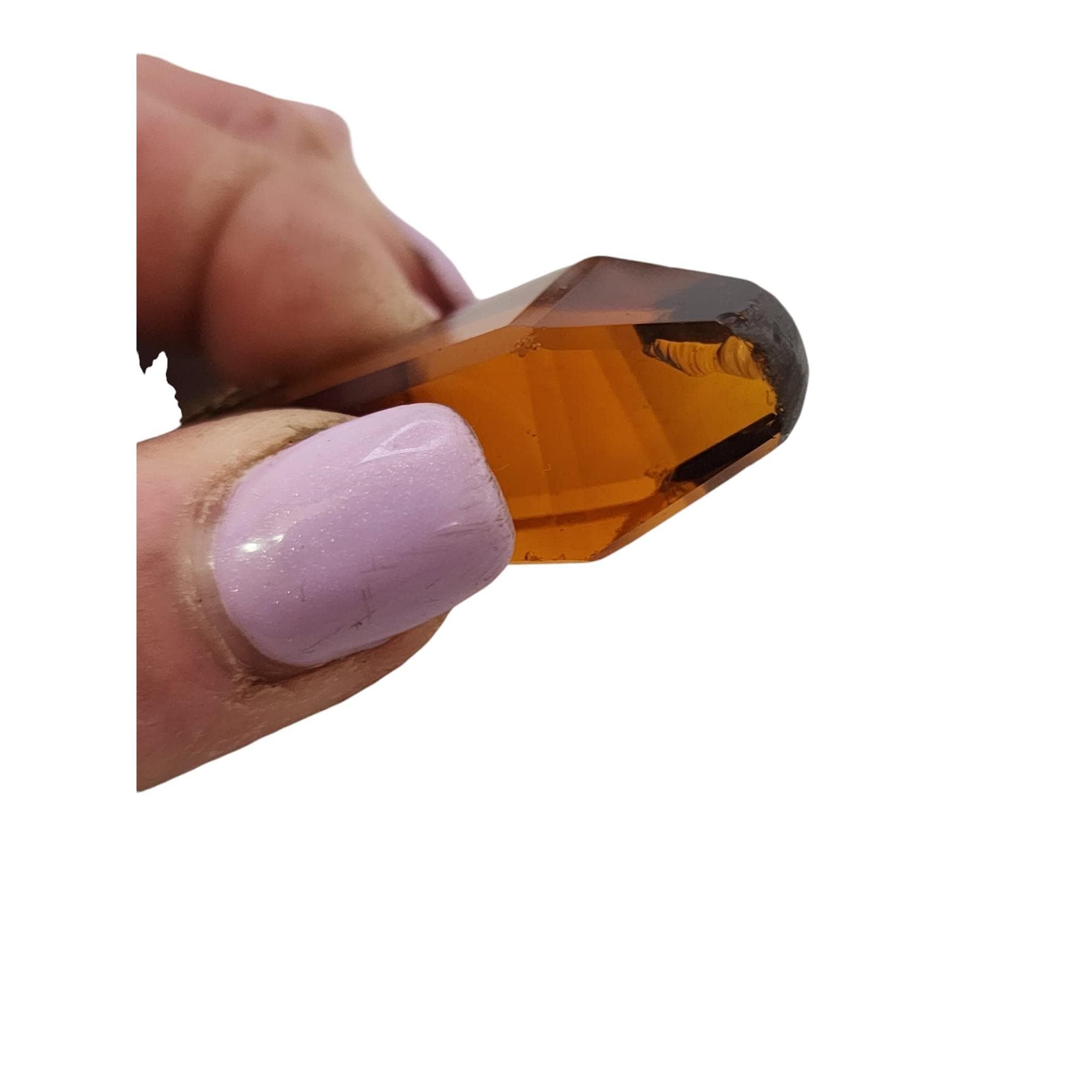 Details: The prism has a chip at the edge of the bottom, and the bottom point has been smoothed round. Some nicks and flea bites. Sq crystal is not 100 percent perfect.
