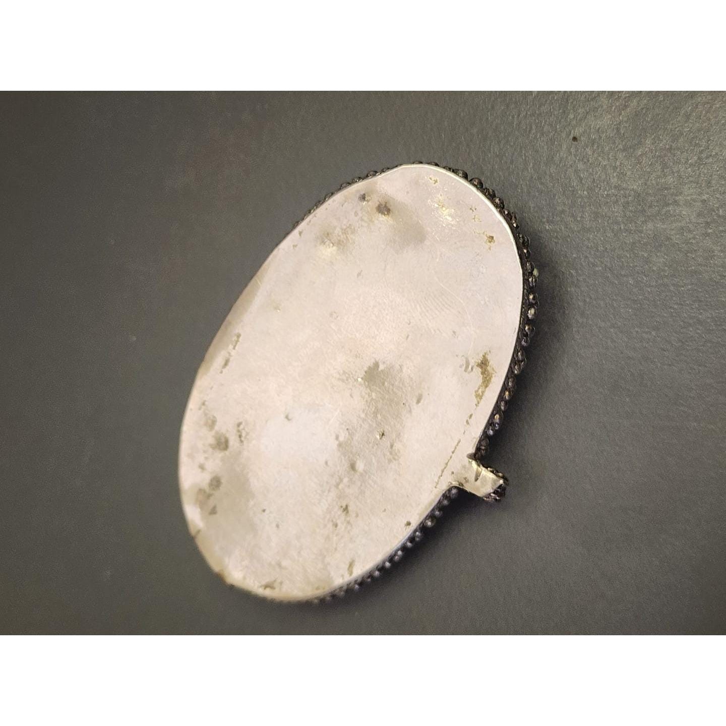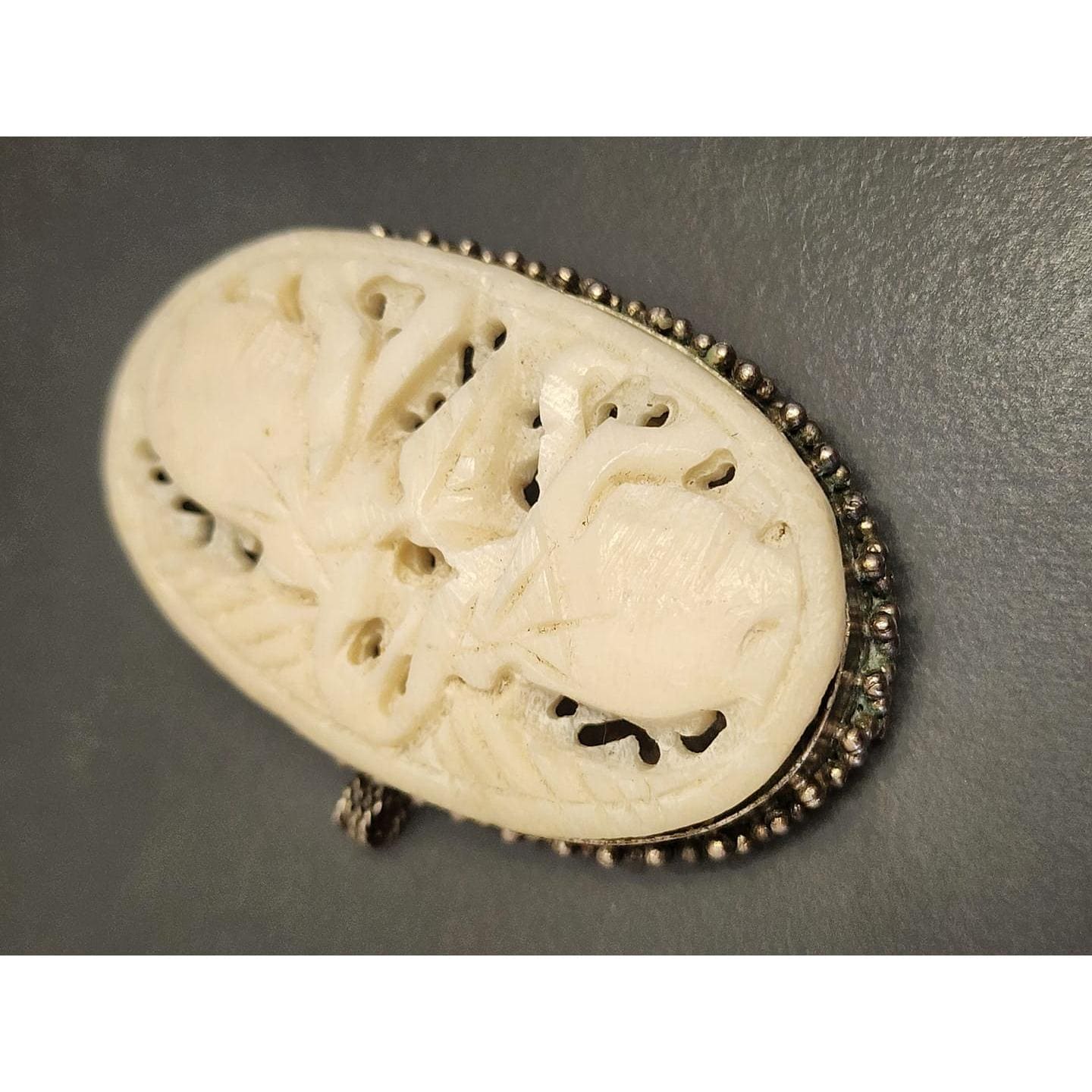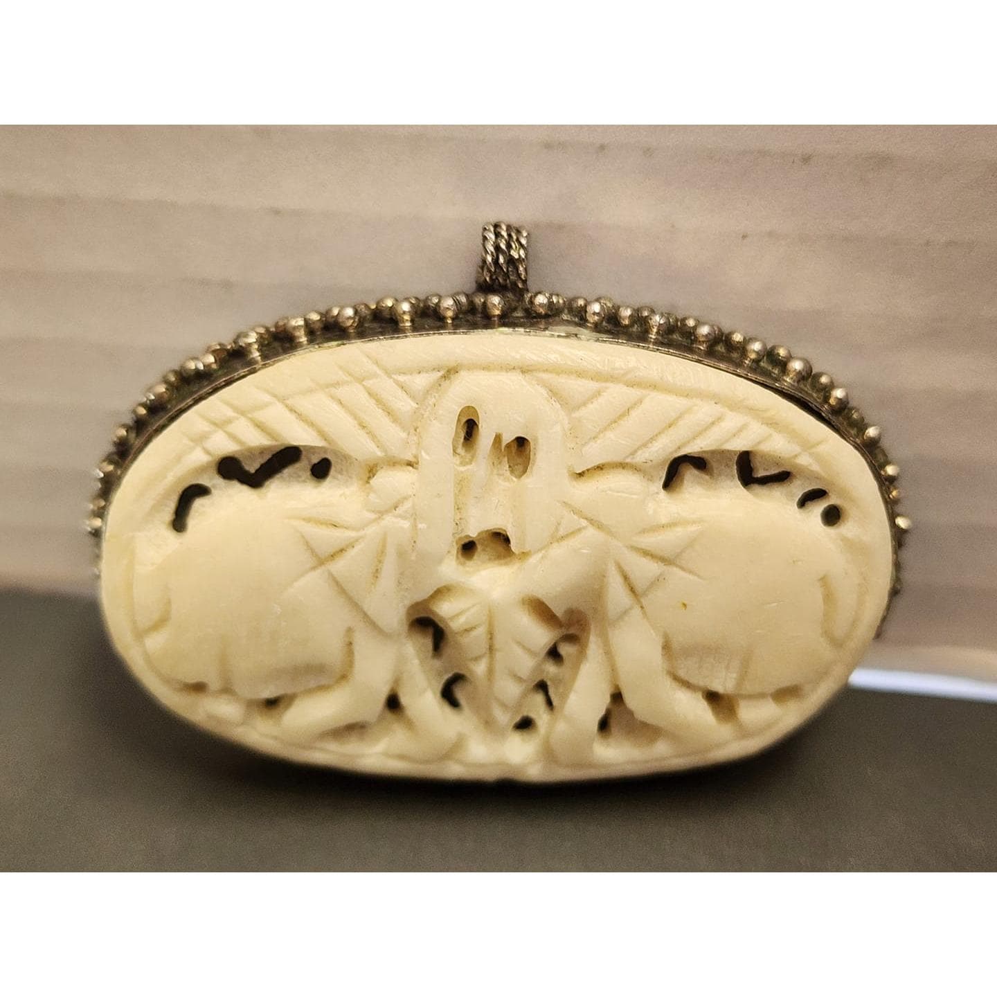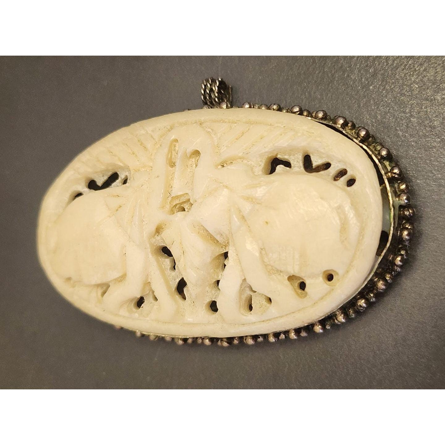 Details: Set in probably alpaca, this organic piece has elephants and doesn't sit 100% in the bezel.