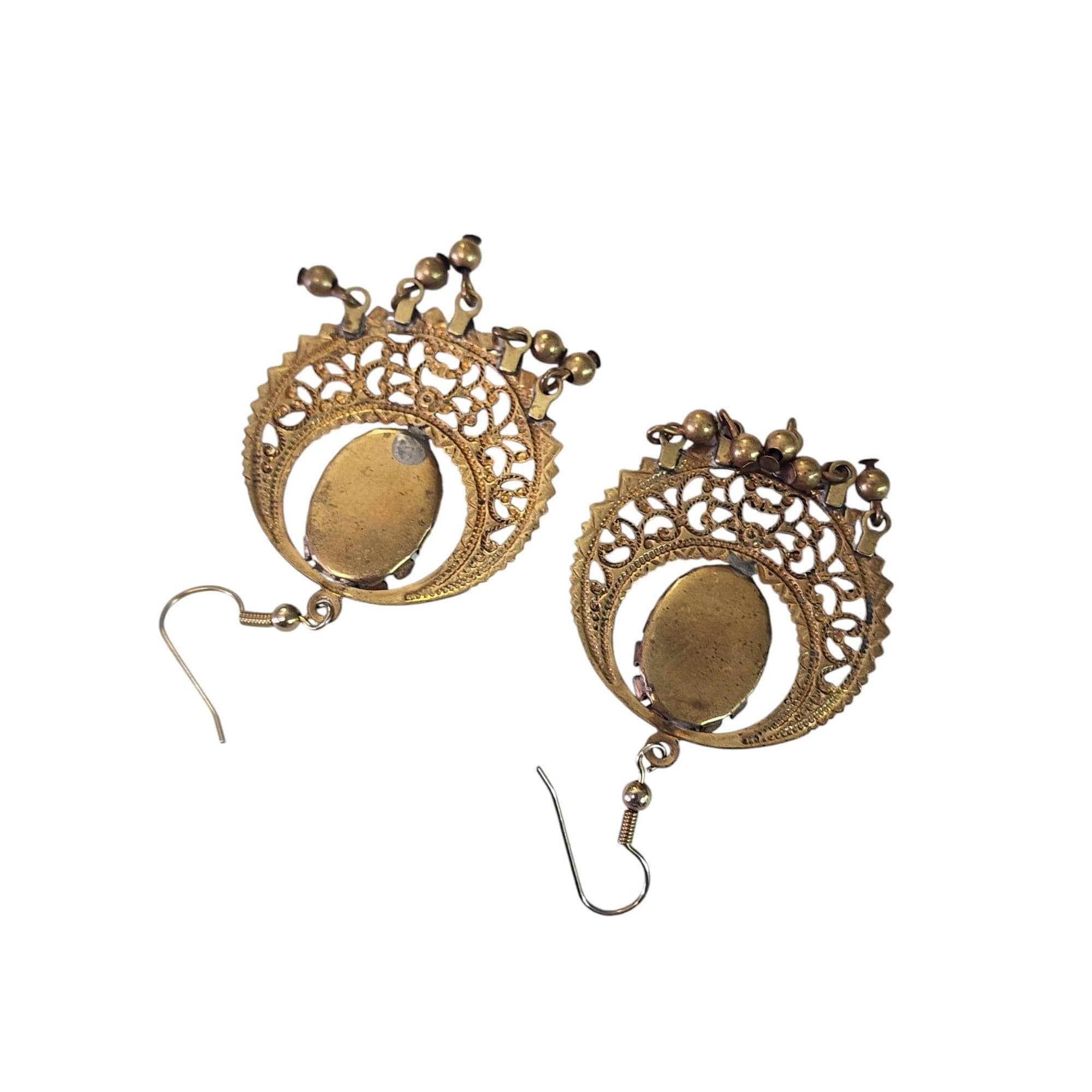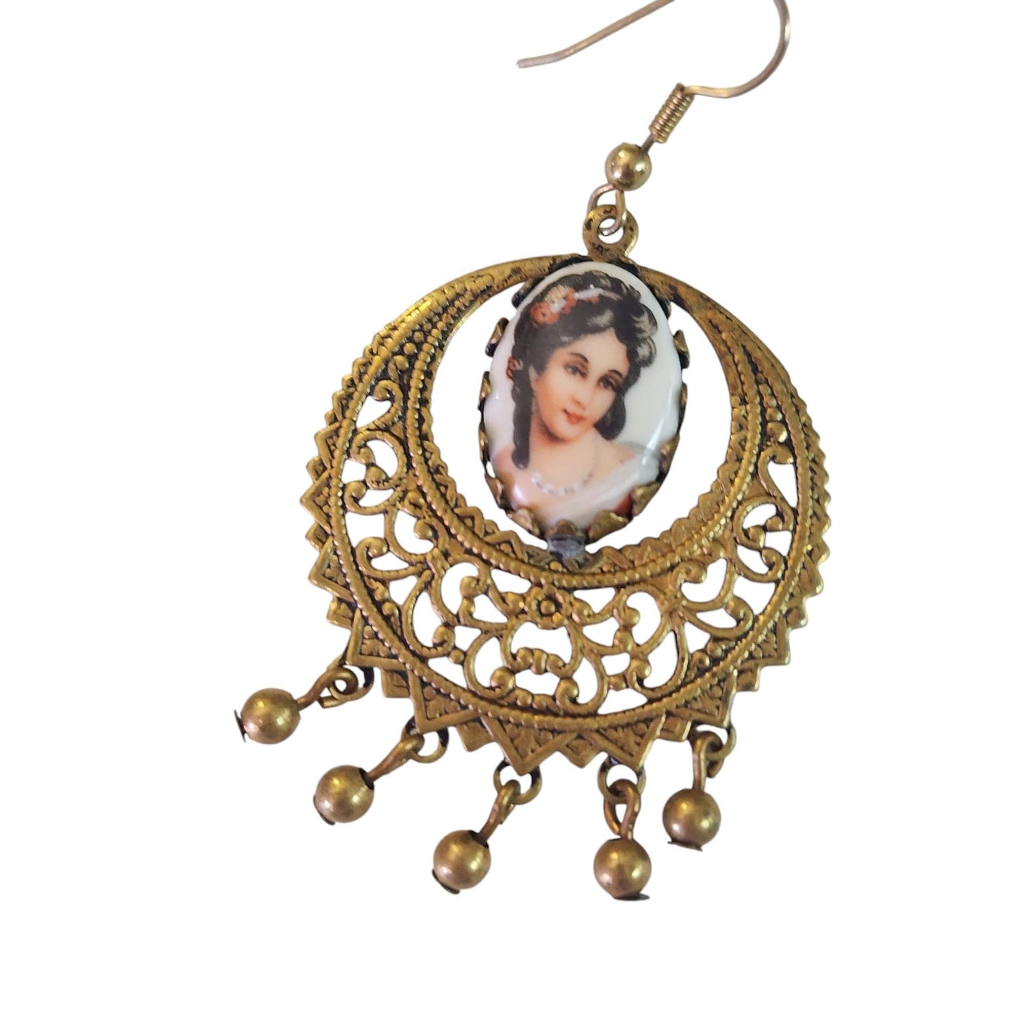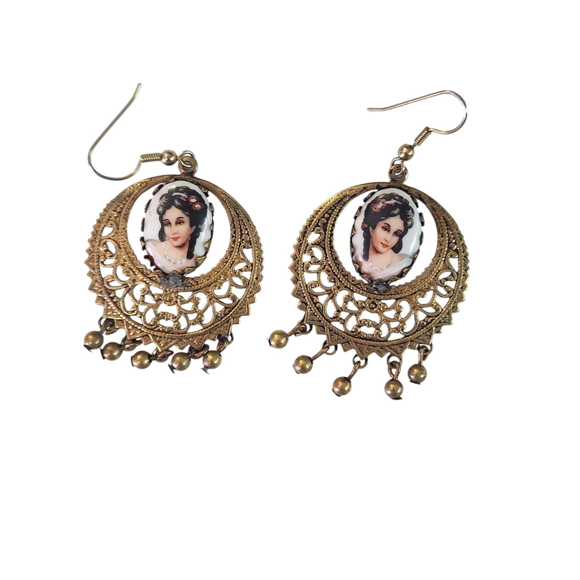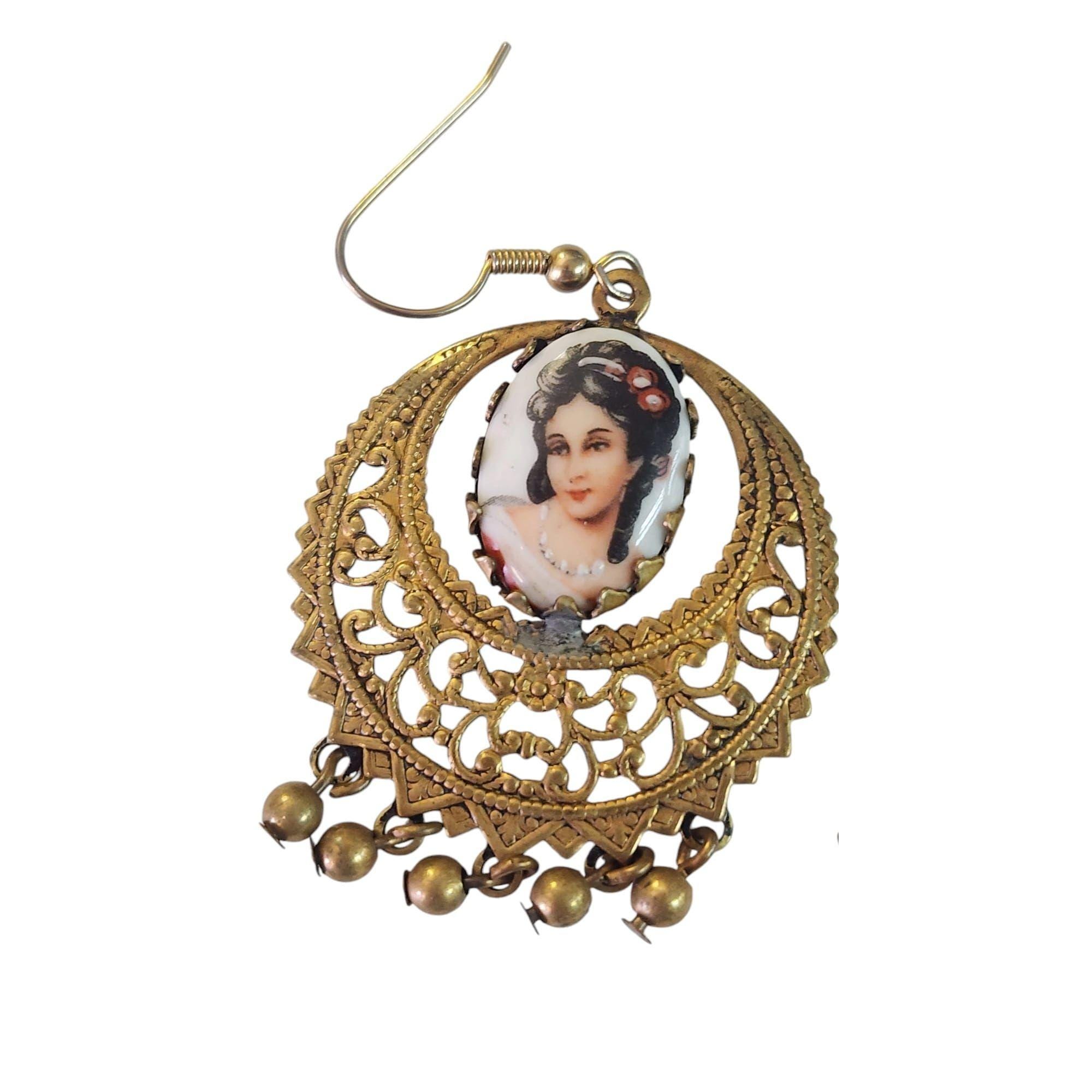 Porcelain Portrait Dangling Earrings, Bezel Set Brass, Vintage Jewelry
