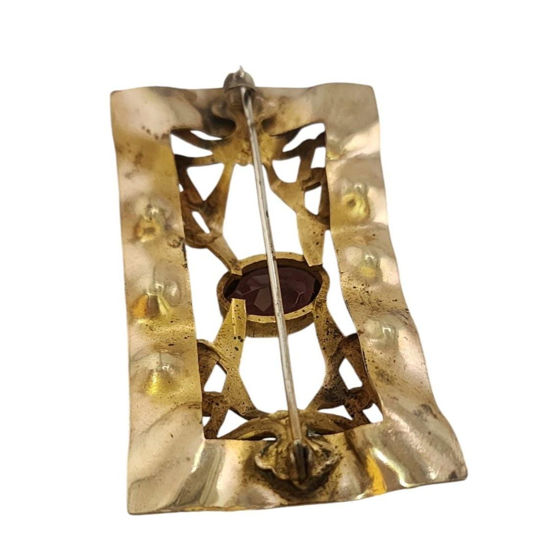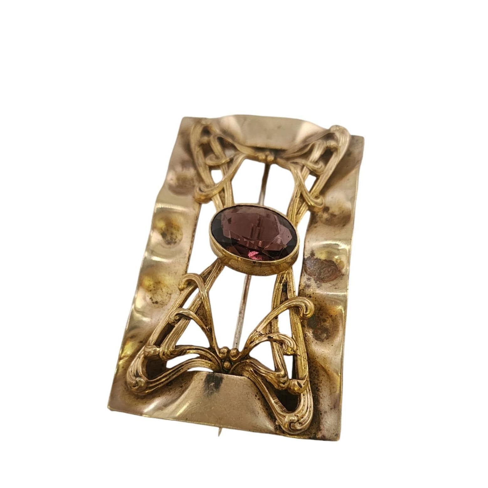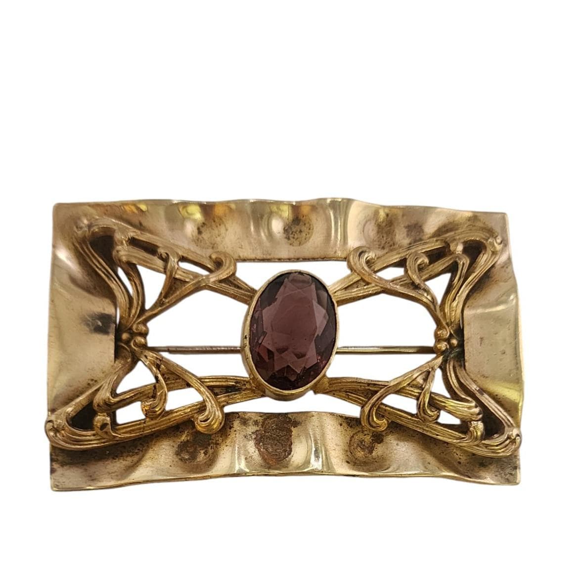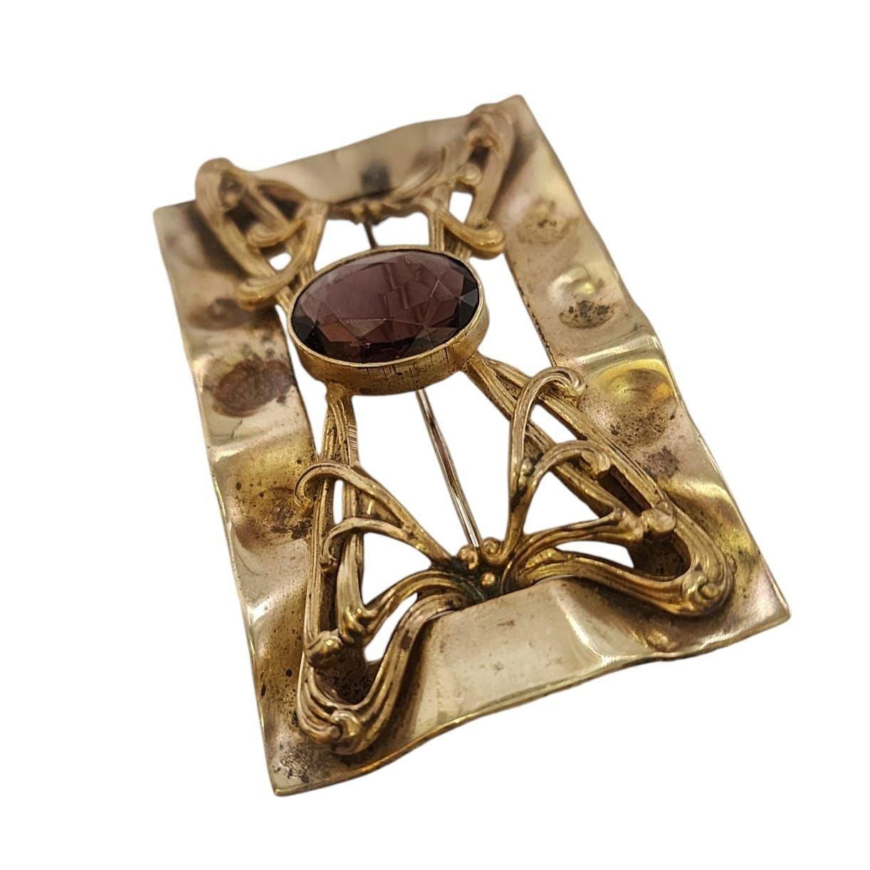 This Victorian-era brass sash brooch showcases elegant Art Nouveau details and a purple faceted glass stone. A timeless piece for collectors.