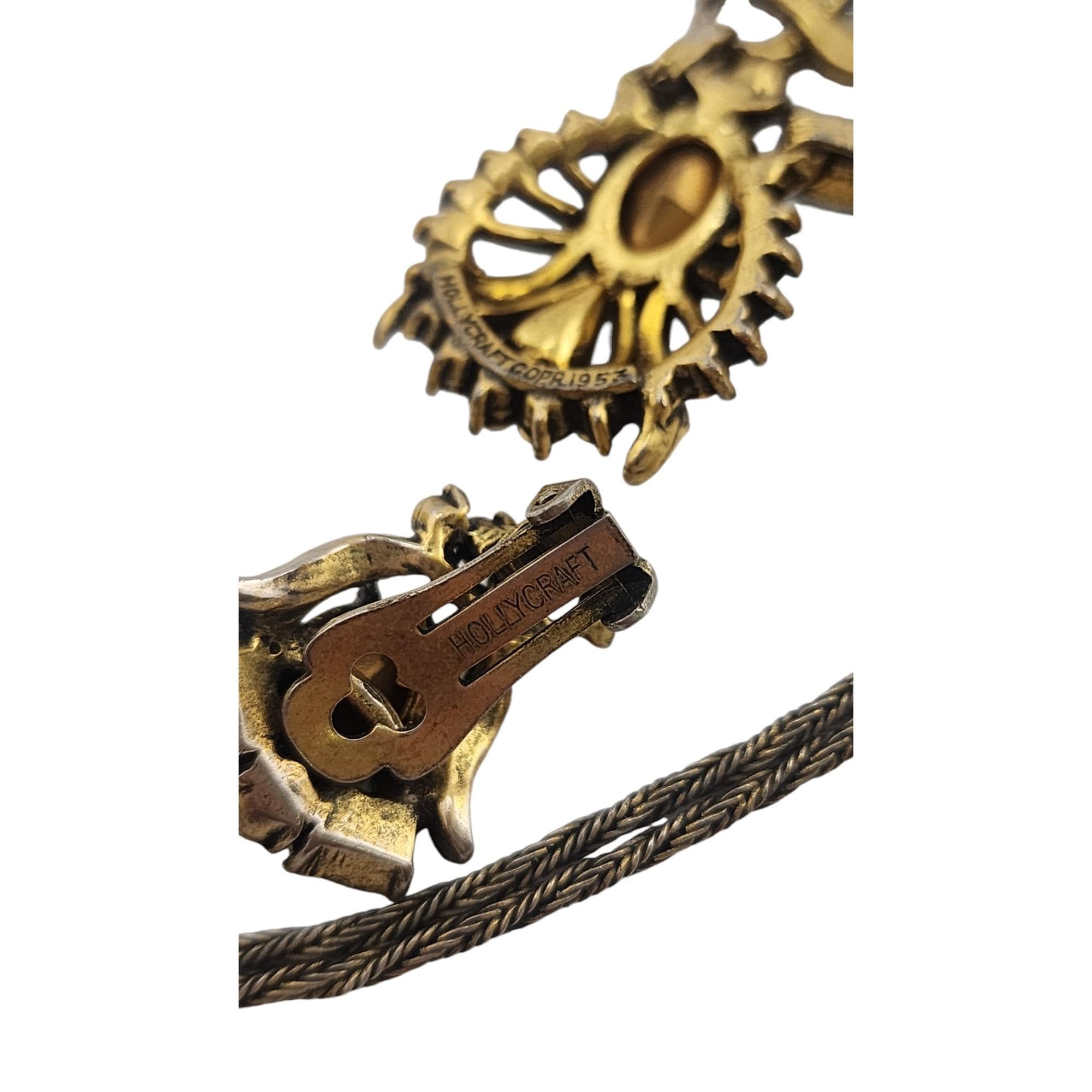 Details: All pieces are signed. 1 earring and necklace are marked 1953. Stones look good and seem original to the set. Fancy closure on the necklace.