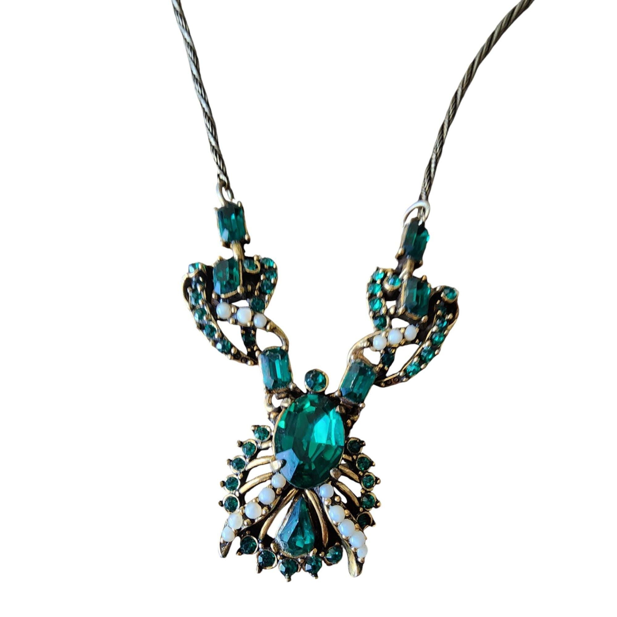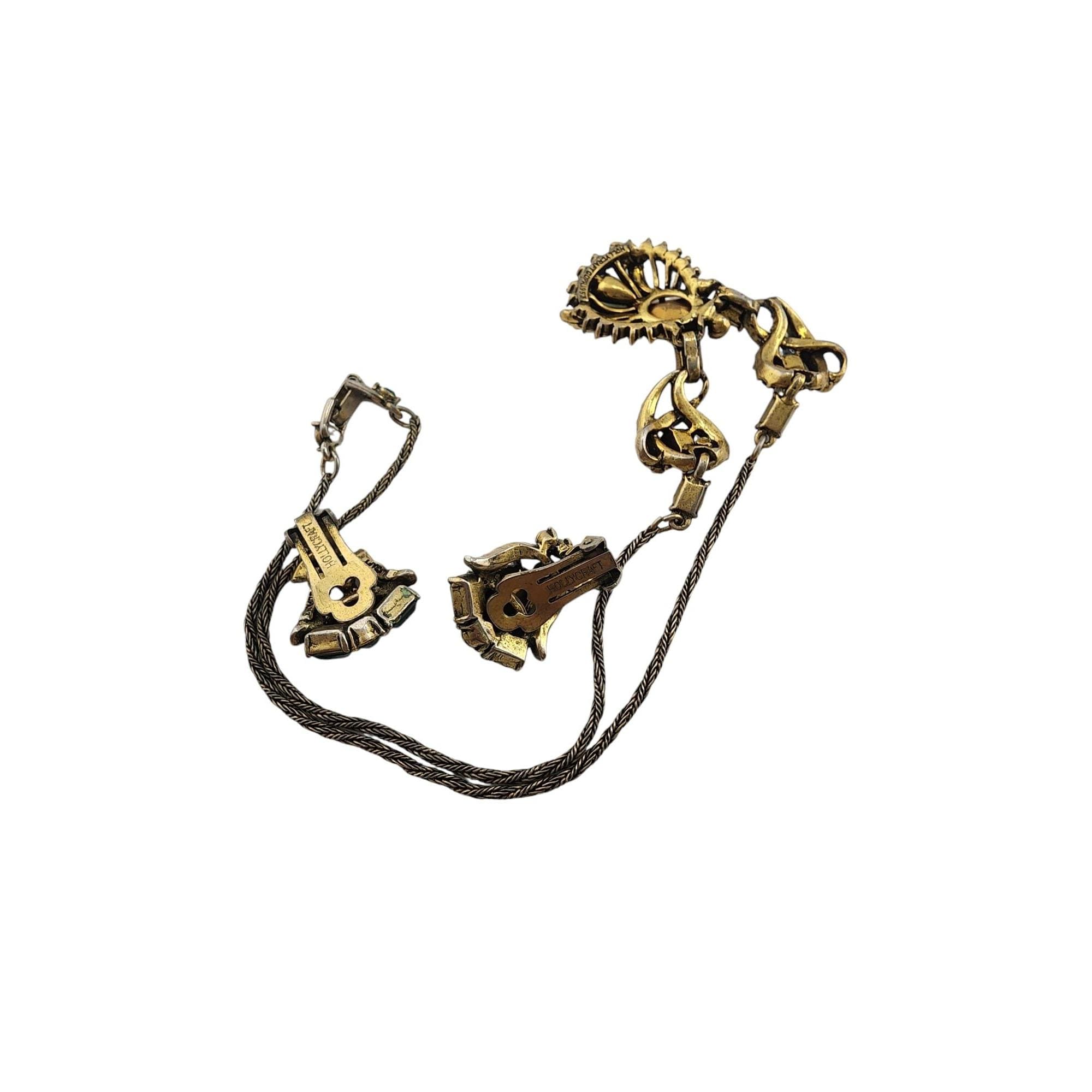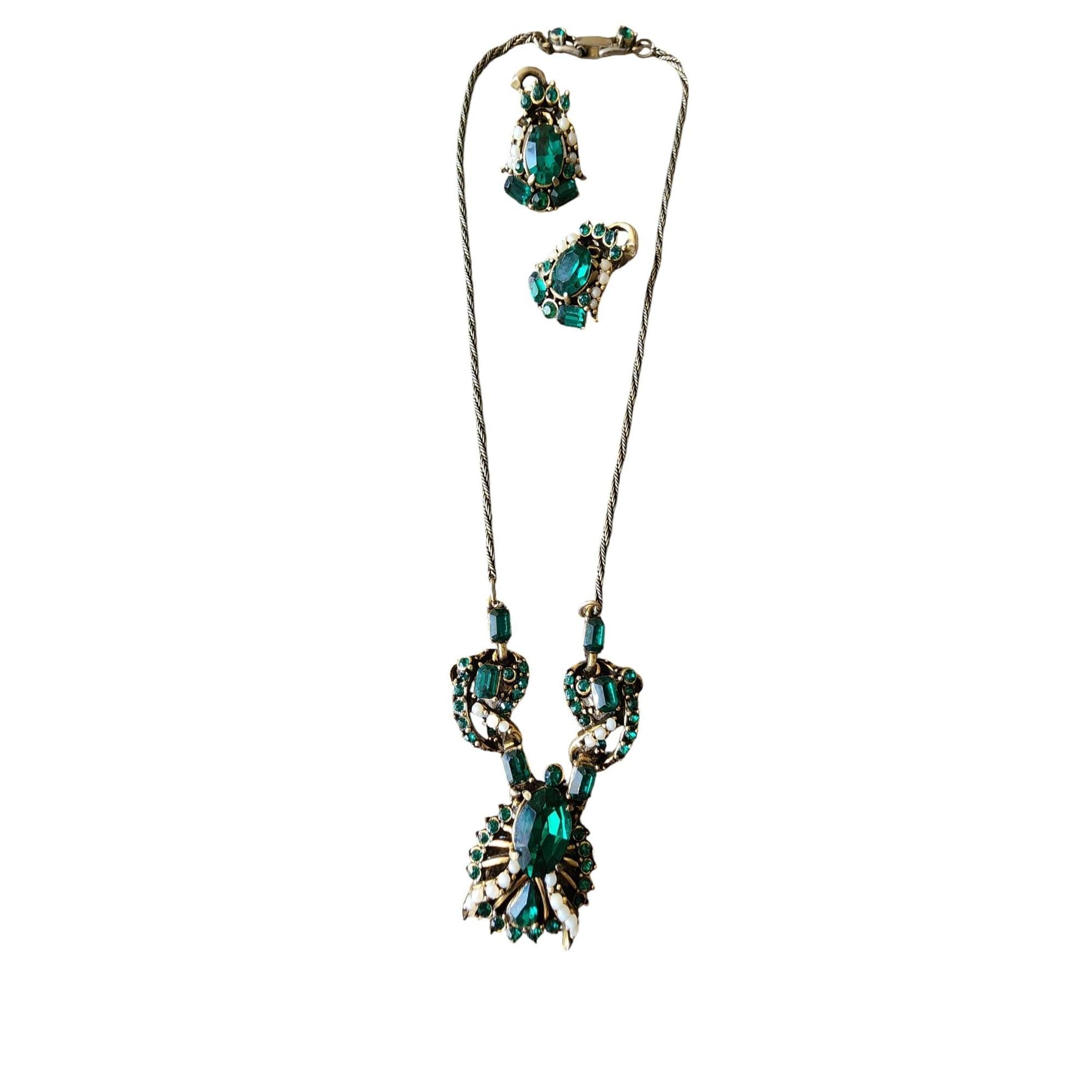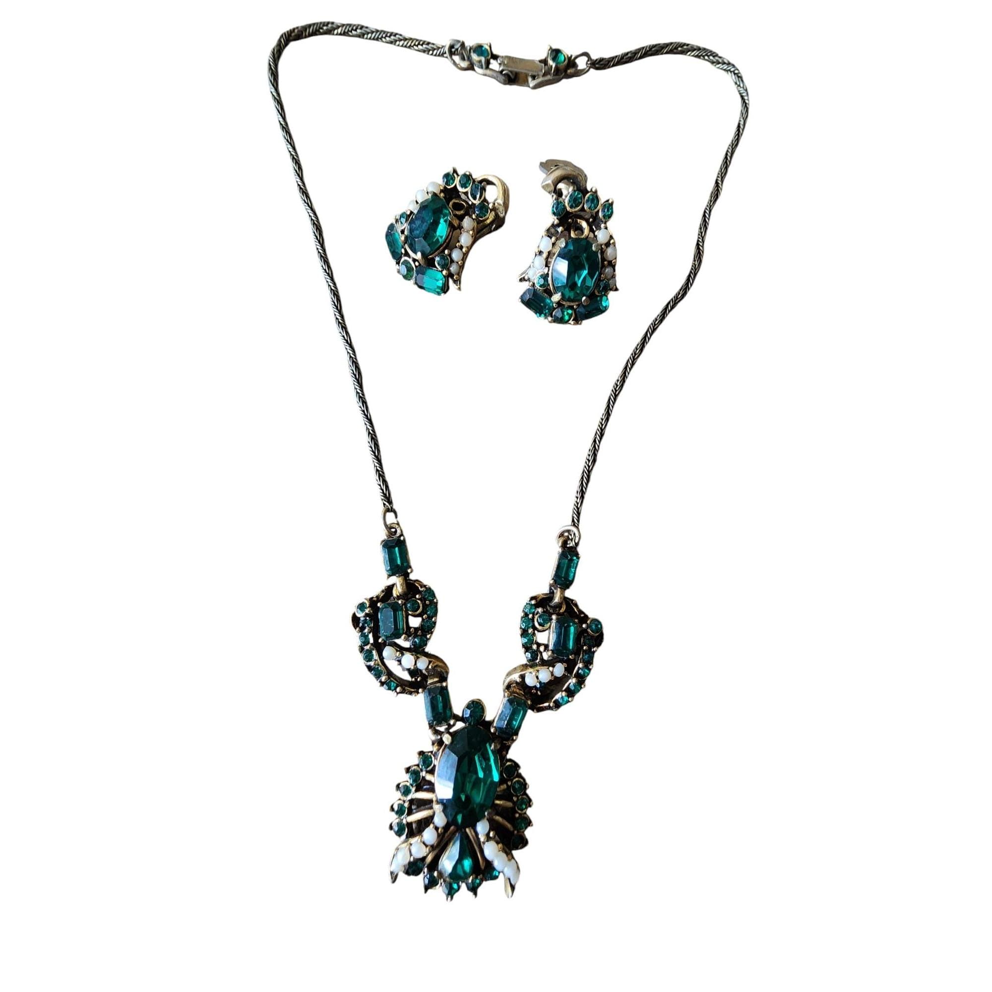 Signed Hollycraft 1953 Green Rhinestone Necklace and Earrings Set (A5796)