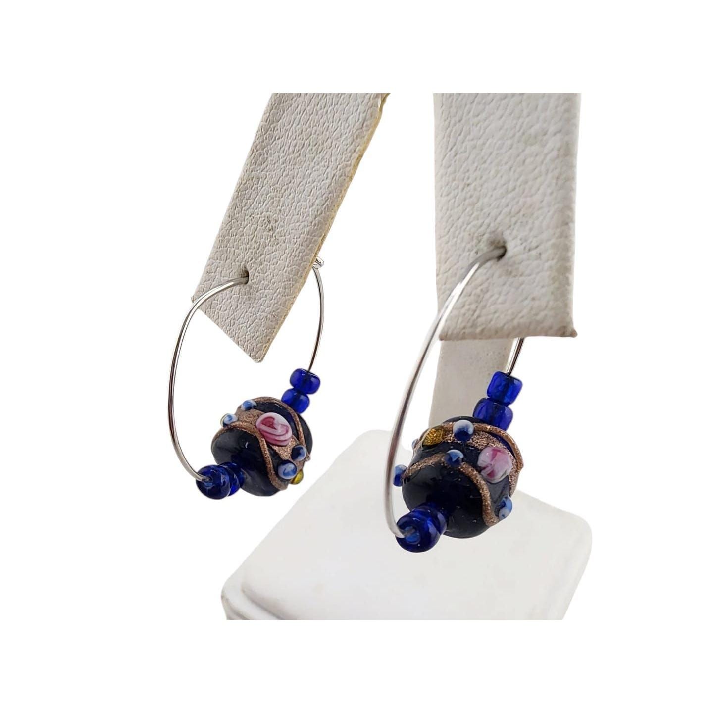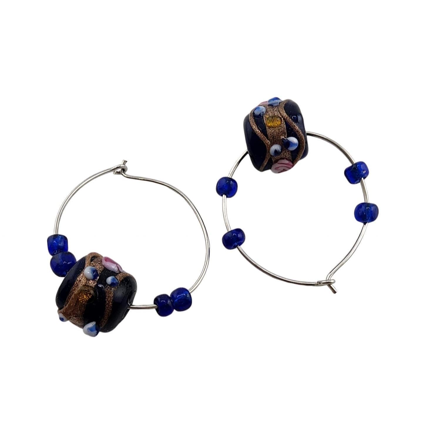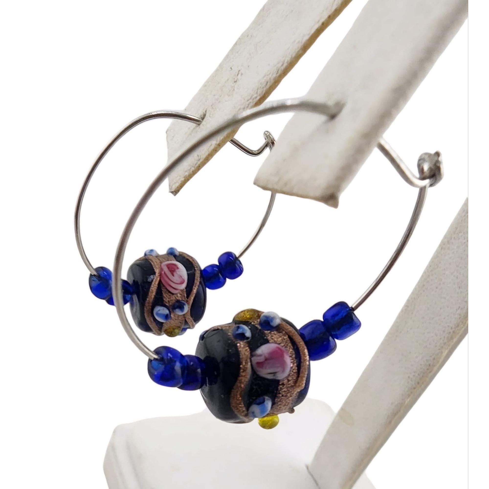 A charming pair of vintage wedding cake hoop earrings featuring intricate floral glass beads. Accentuated with cobalt blue beads and a delicate vintage finish.