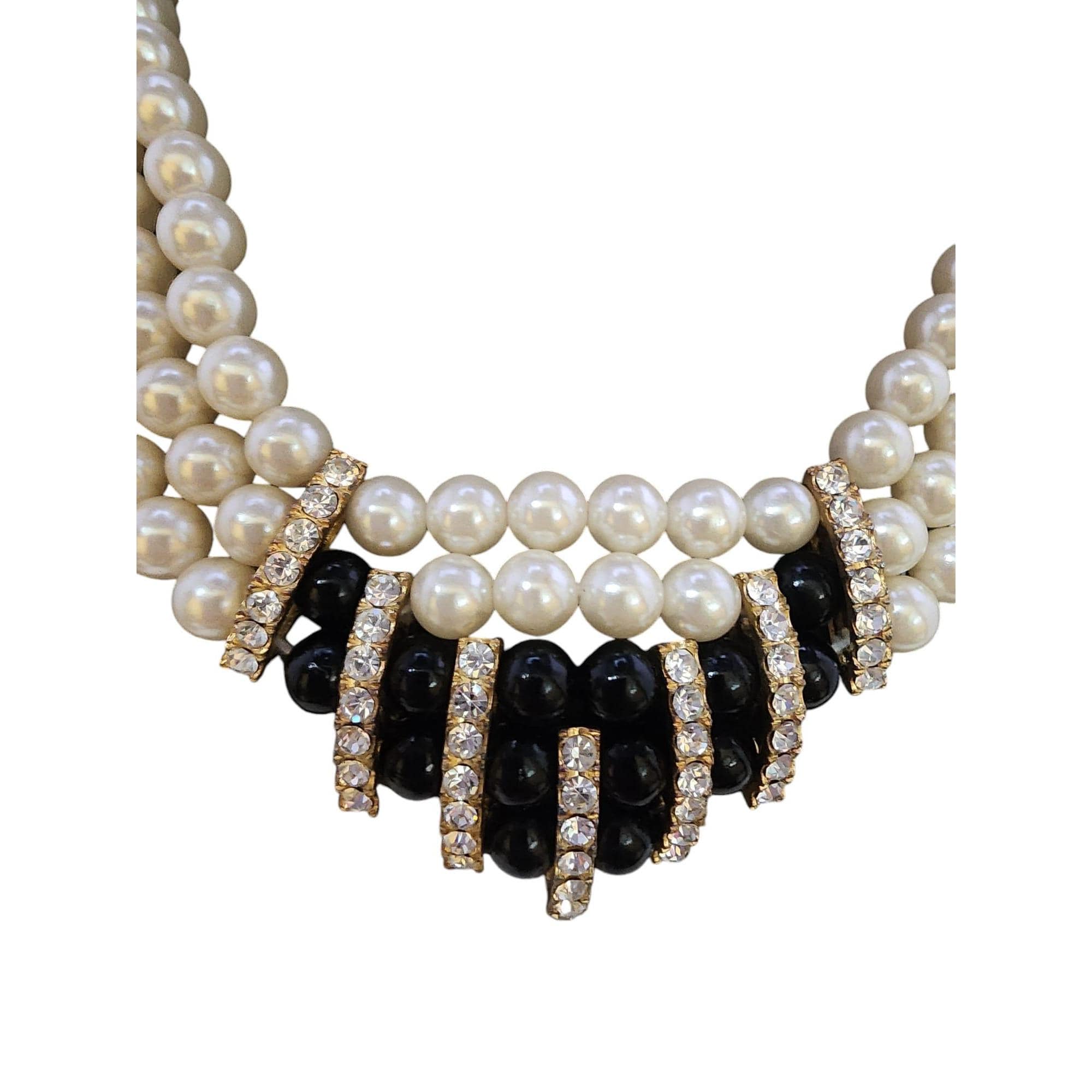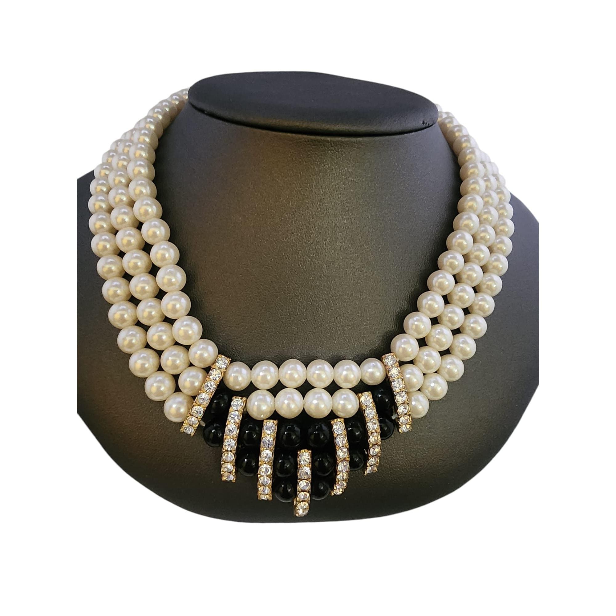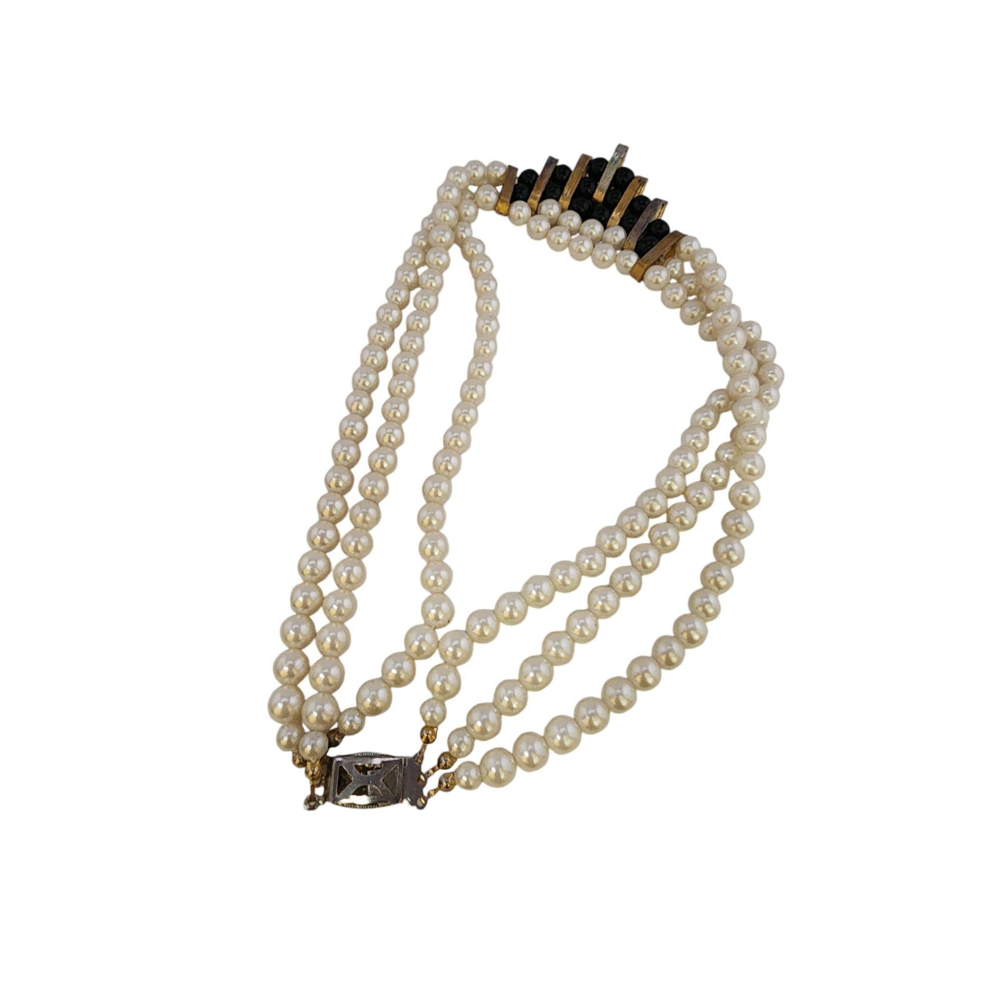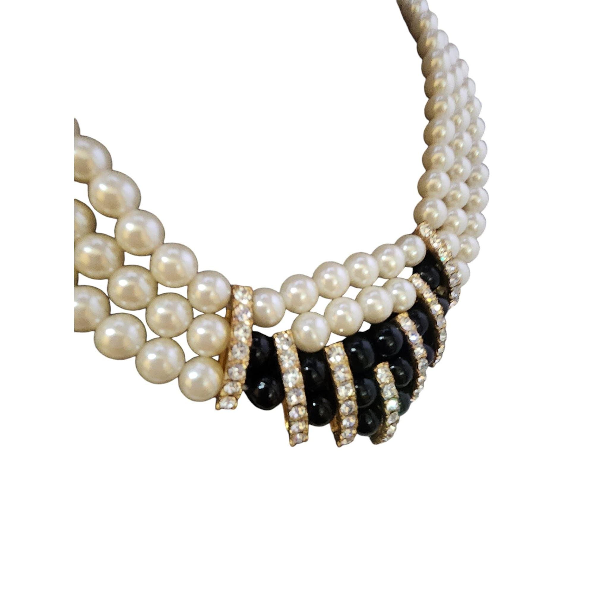 This vintage 1980s necklace features triple strands of lustrous faux pearls with rhinestone and black bead accents. Elegant and timeless, it measures 17" and has minor wear to the back plating, showcasing its vintage charm.