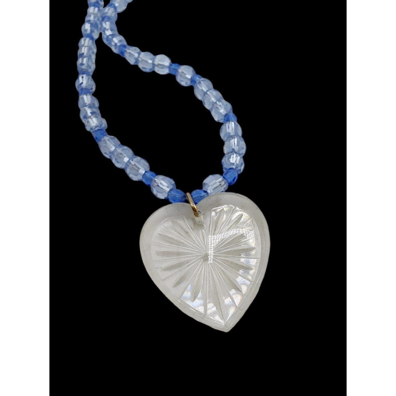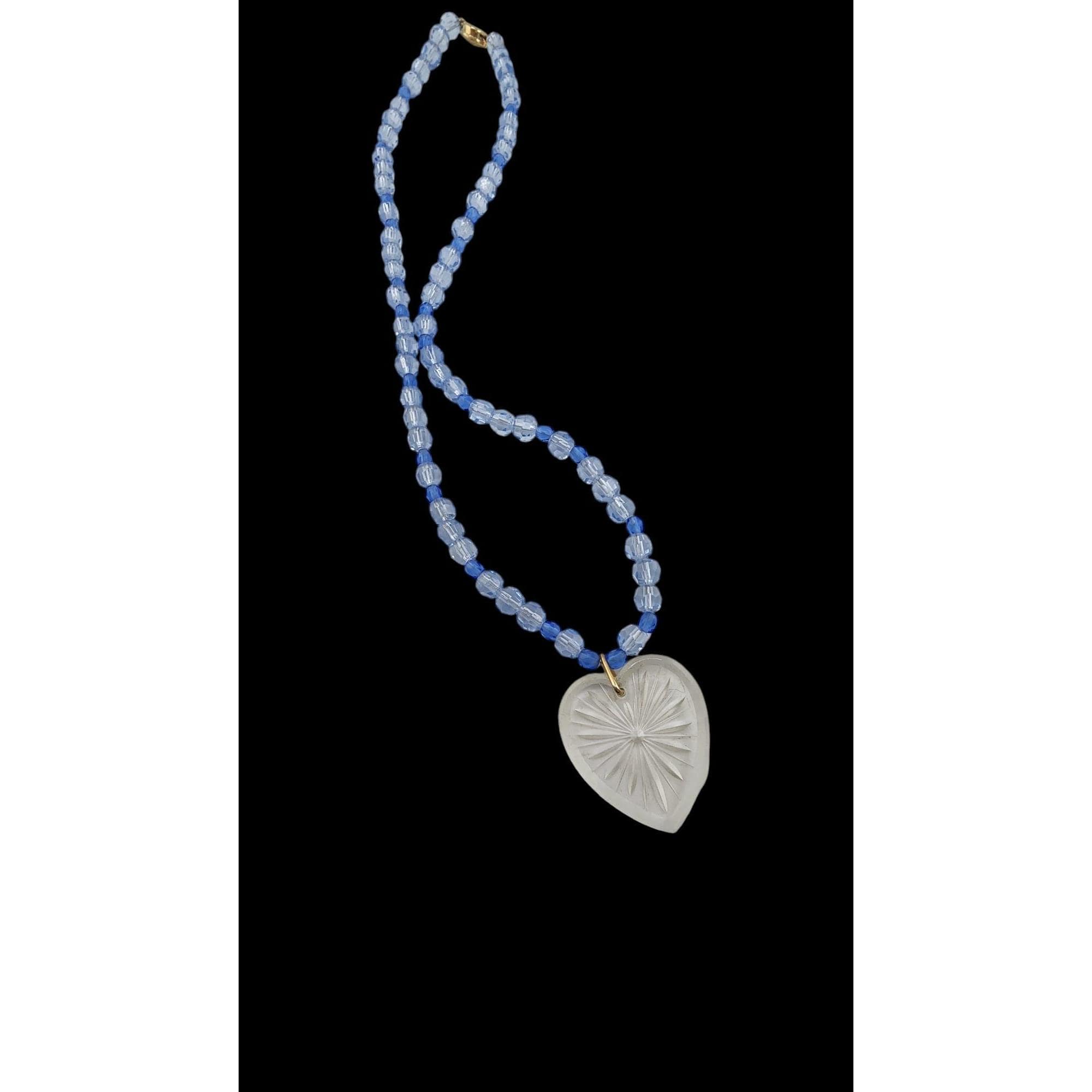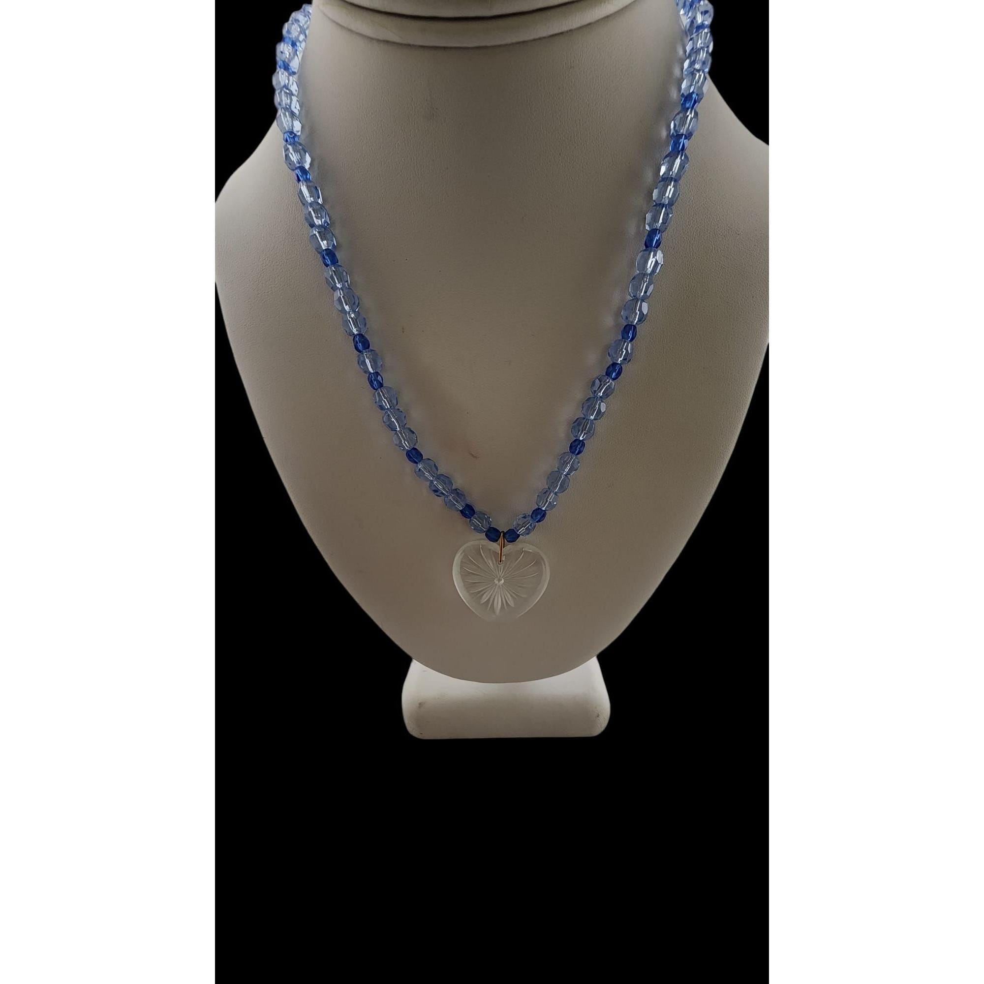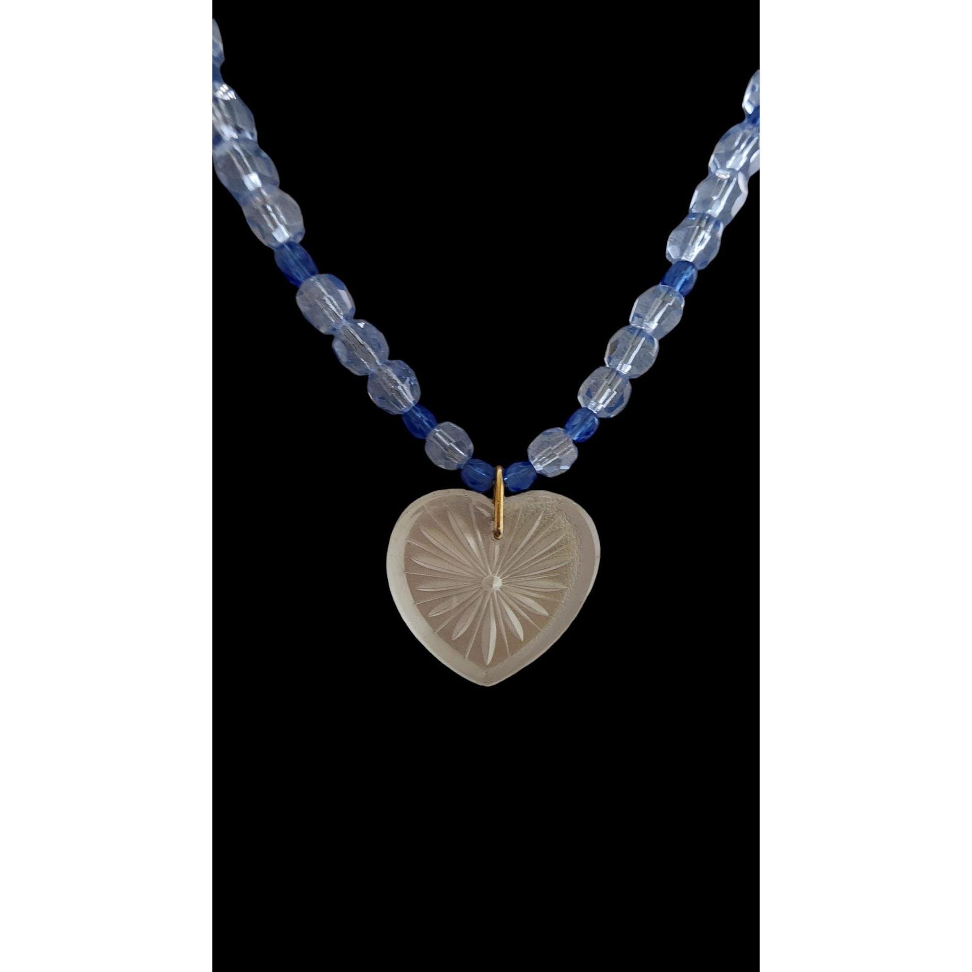 This vintage necklace features a stunning etched glass heart pendant and two-tone crystal beads. A fancy push-in clasp adds a classic touch.