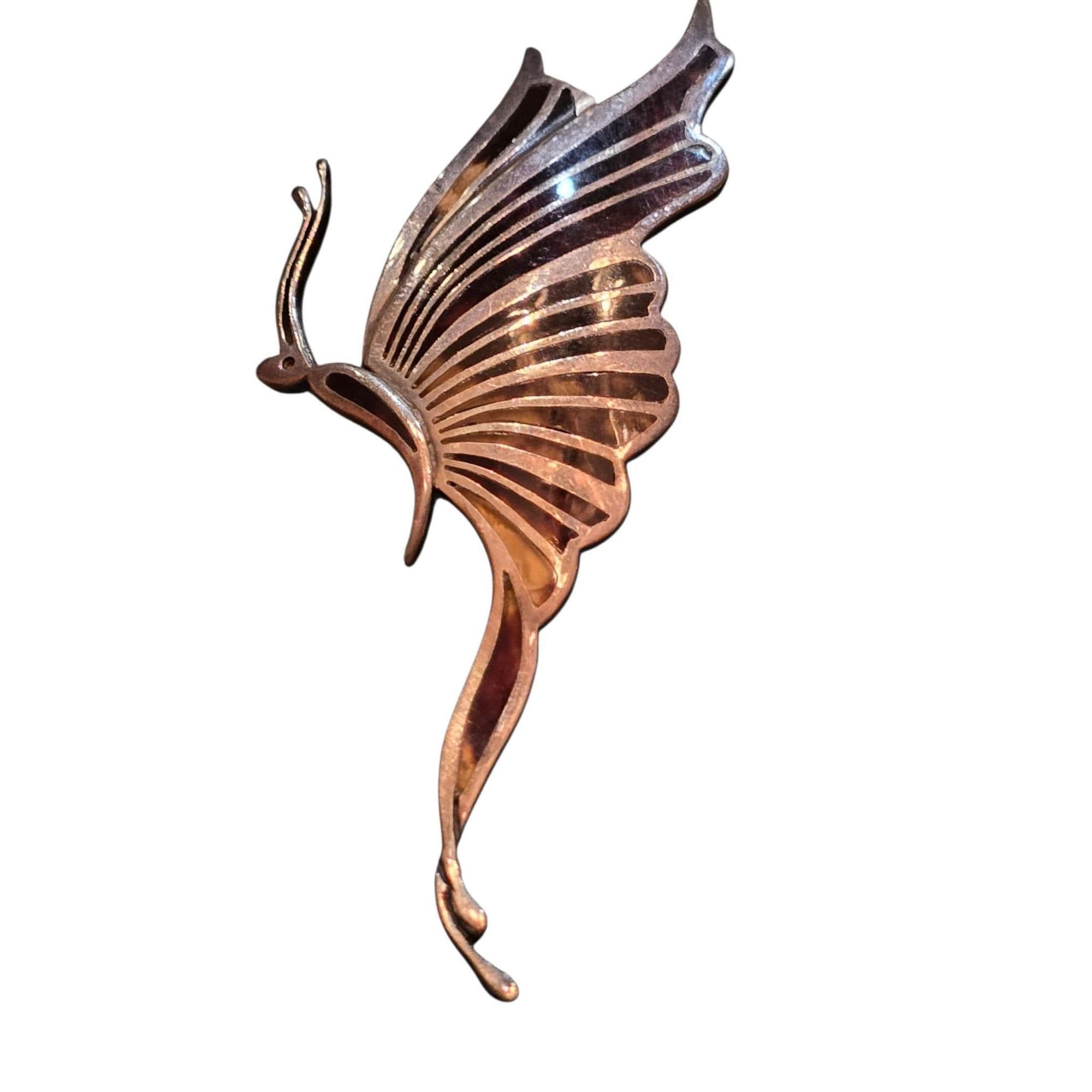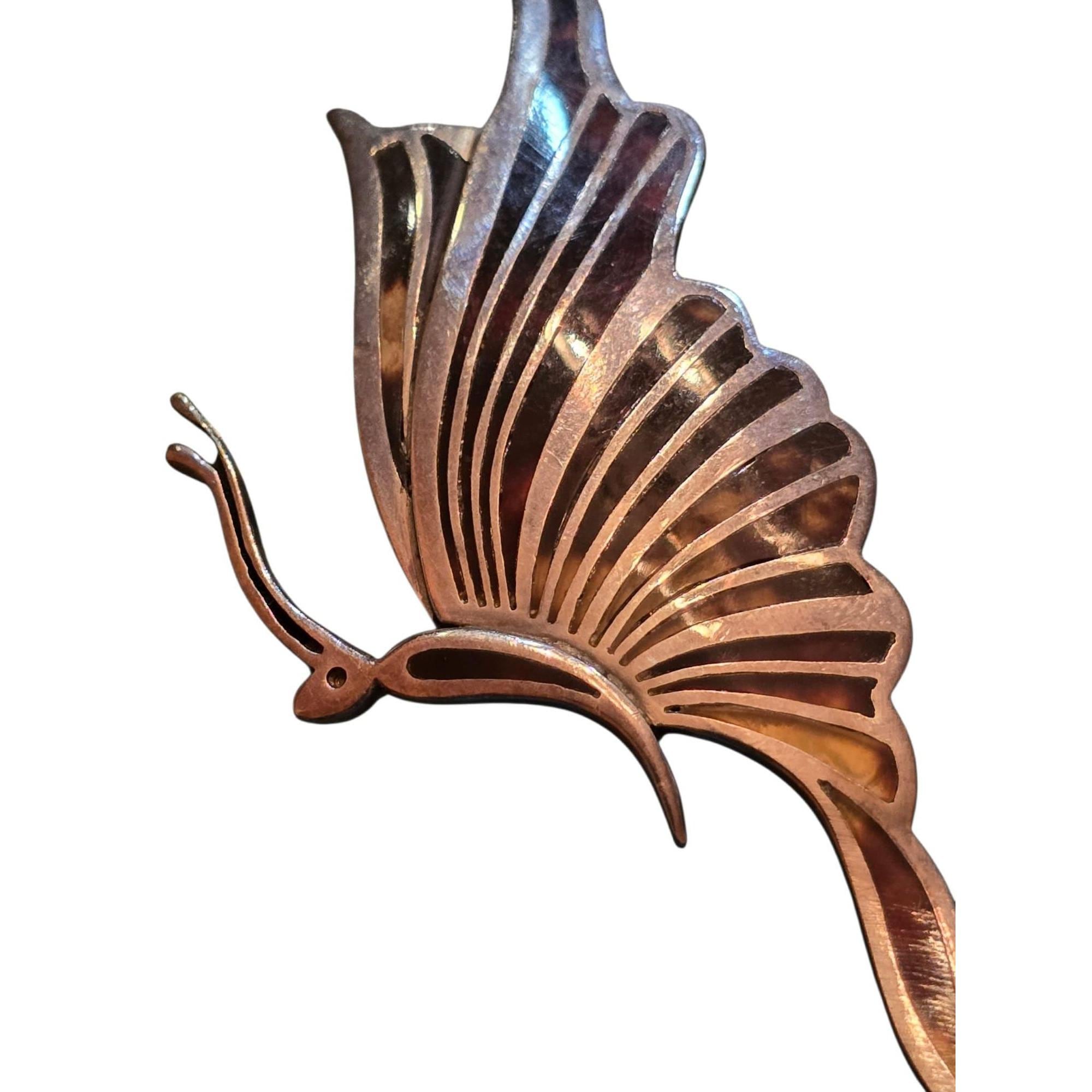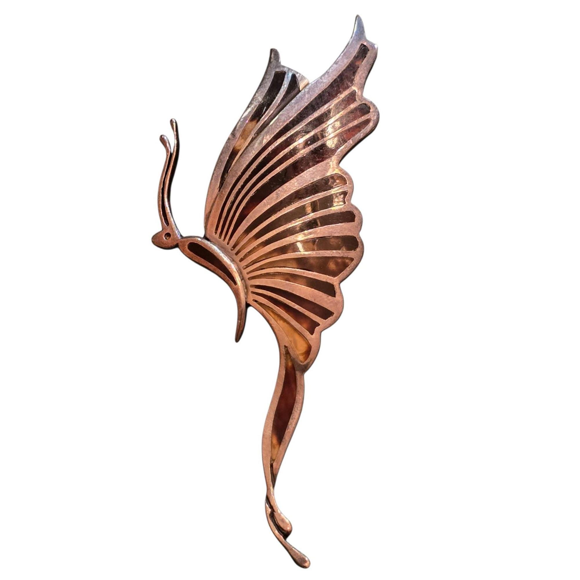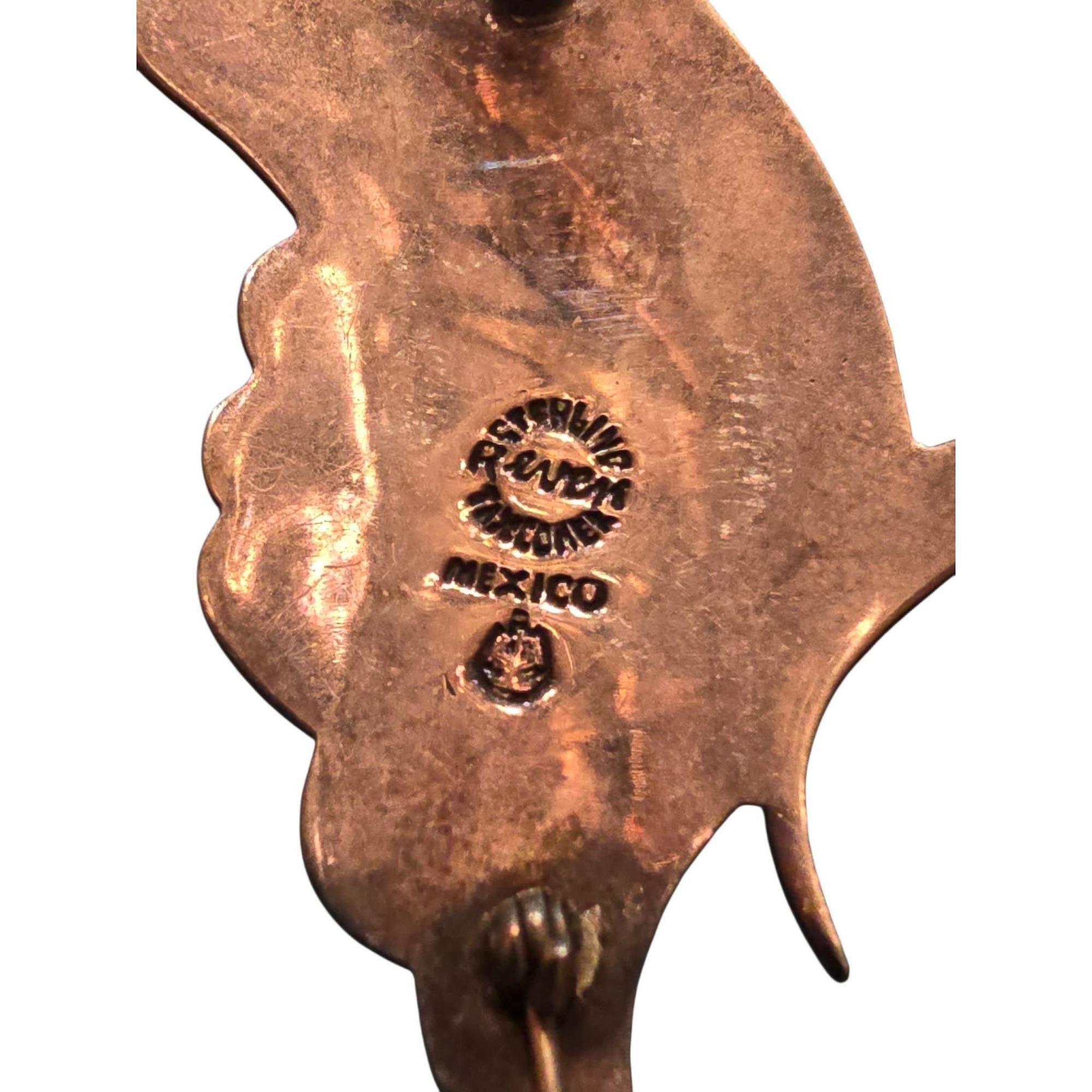 This vintage brooch from Taxco, Mexico, showcases intricate butterfly designs in sterling silver. The faux tortoise inlay adds depth and elegance to this timeless piece.