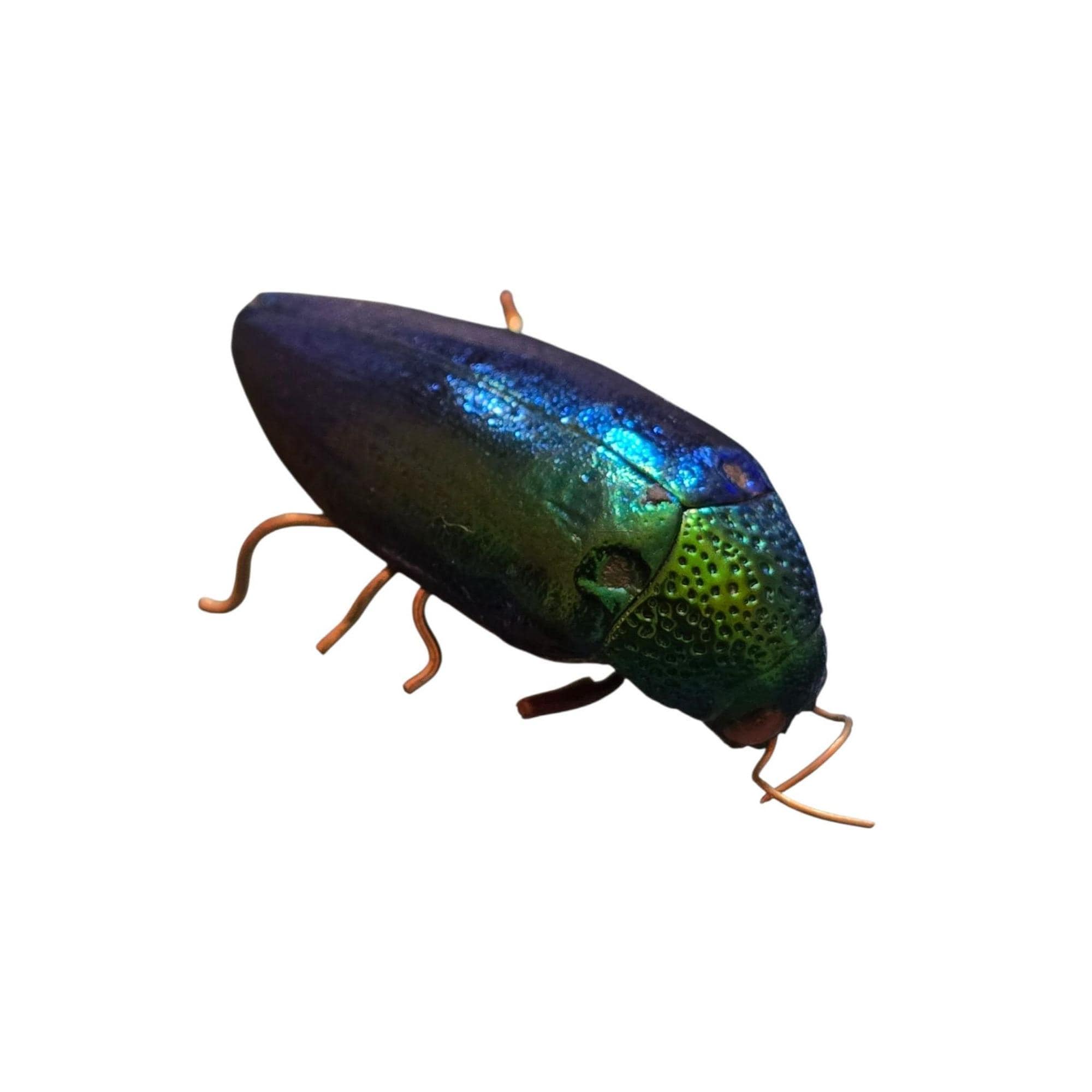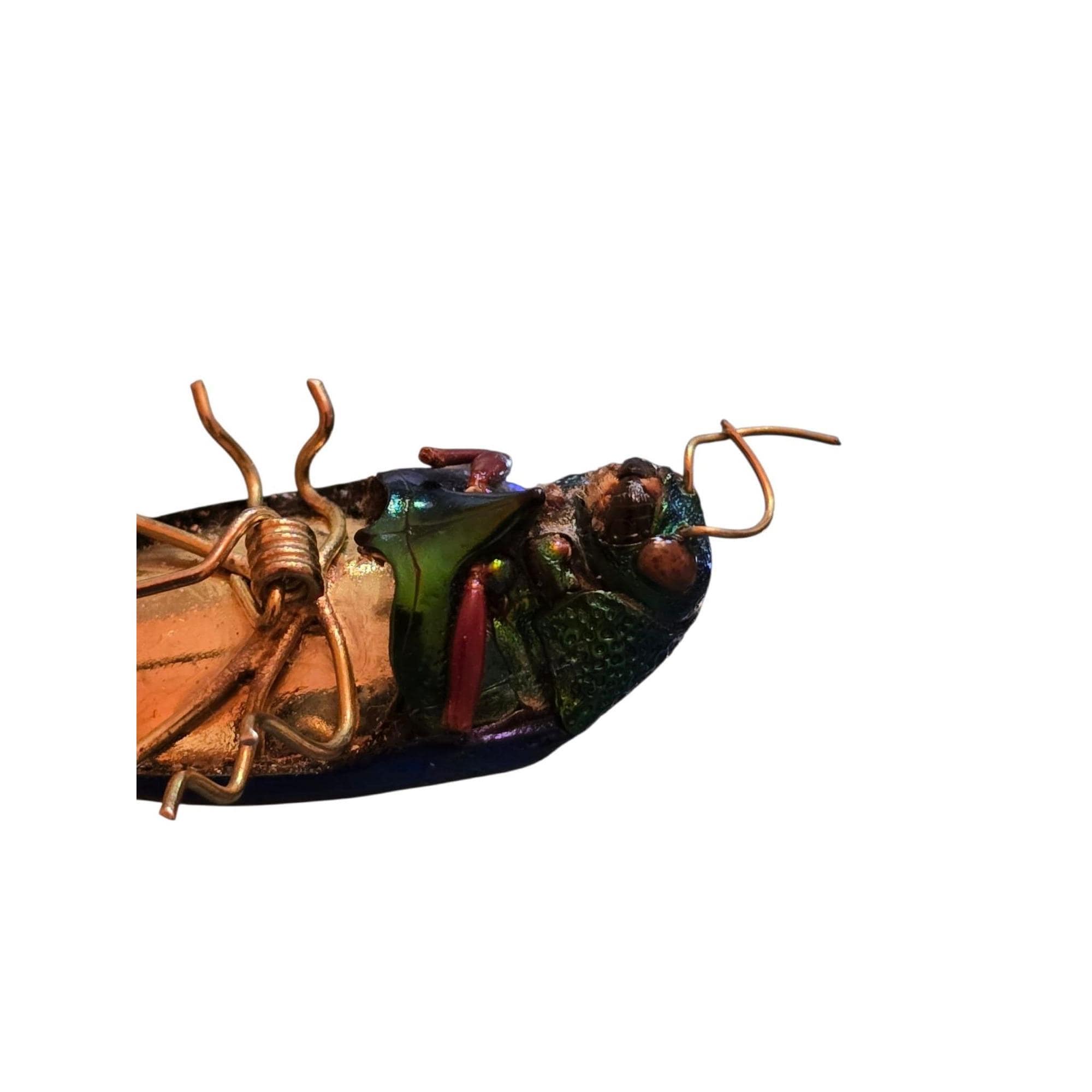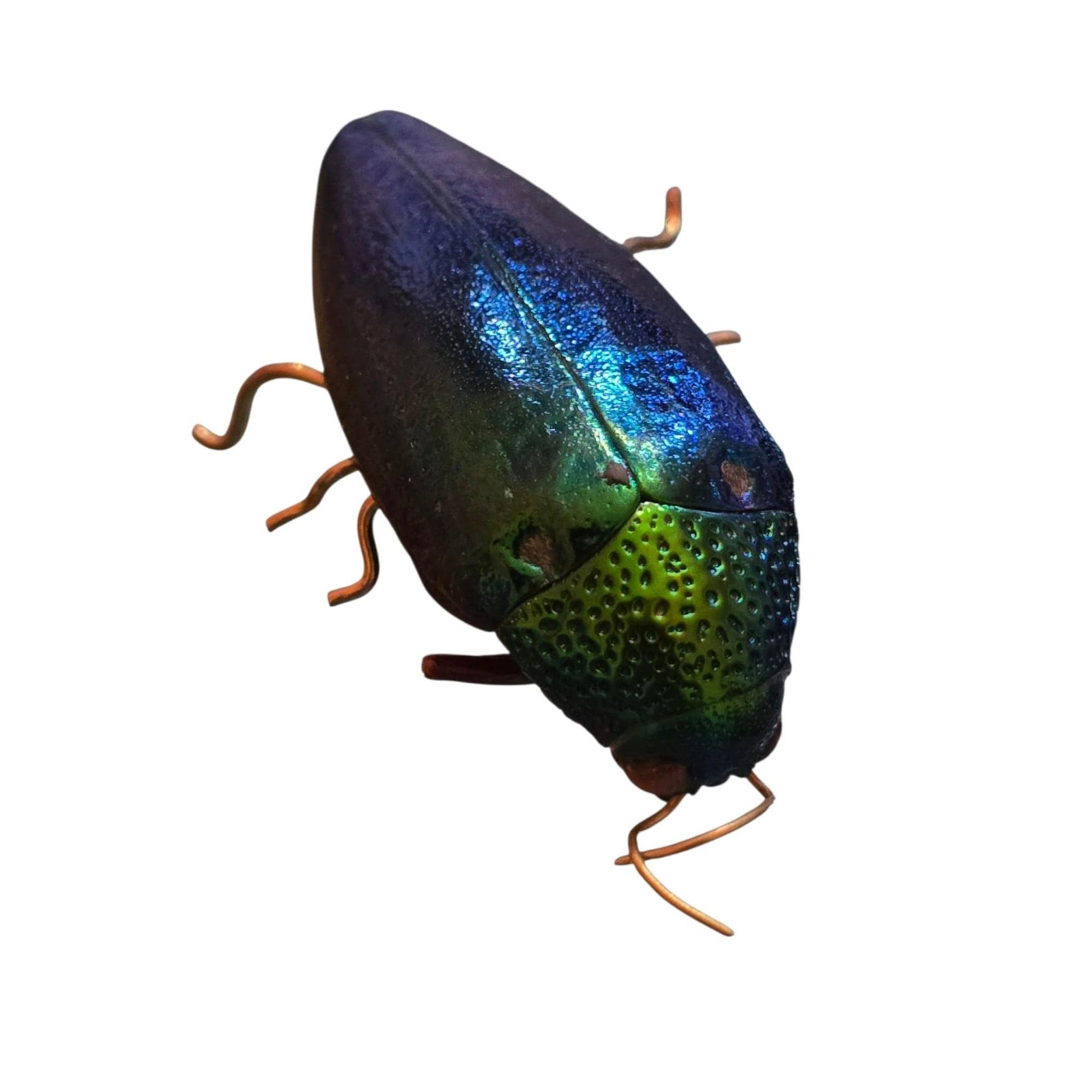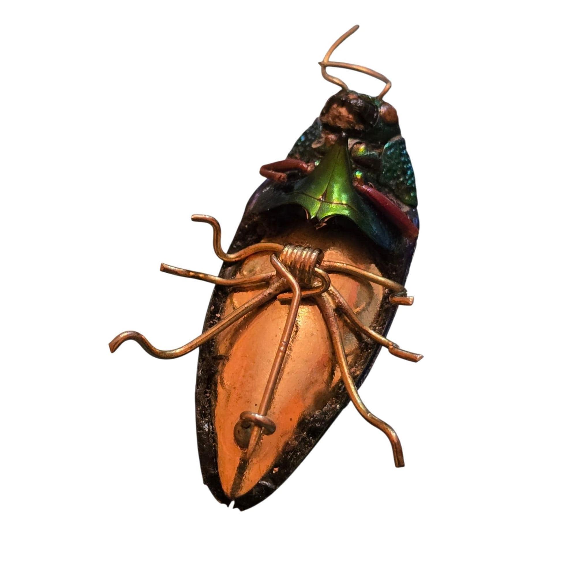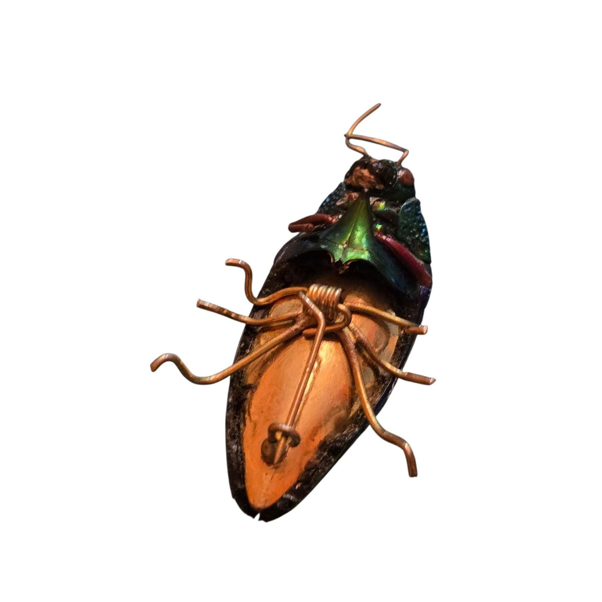 This antique beetle pin showcases an iridescent beetle in good condition, featuring a vintage C-clasp for secure attachment. A unique collectible. I believe this was once an actual beetle.