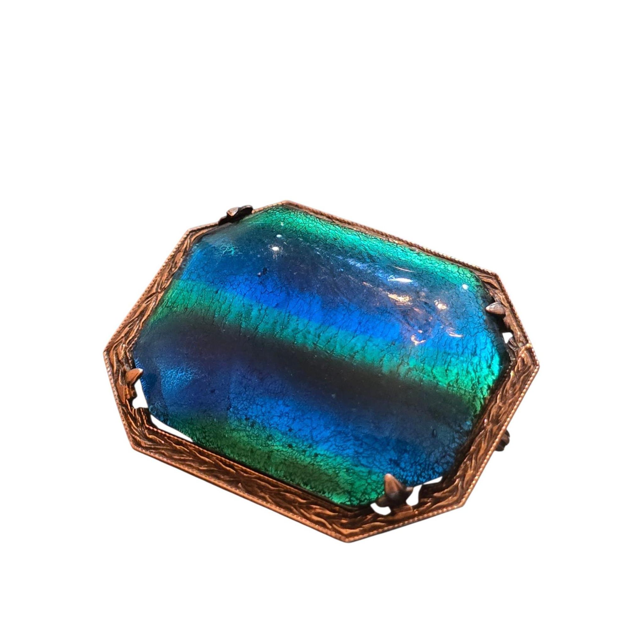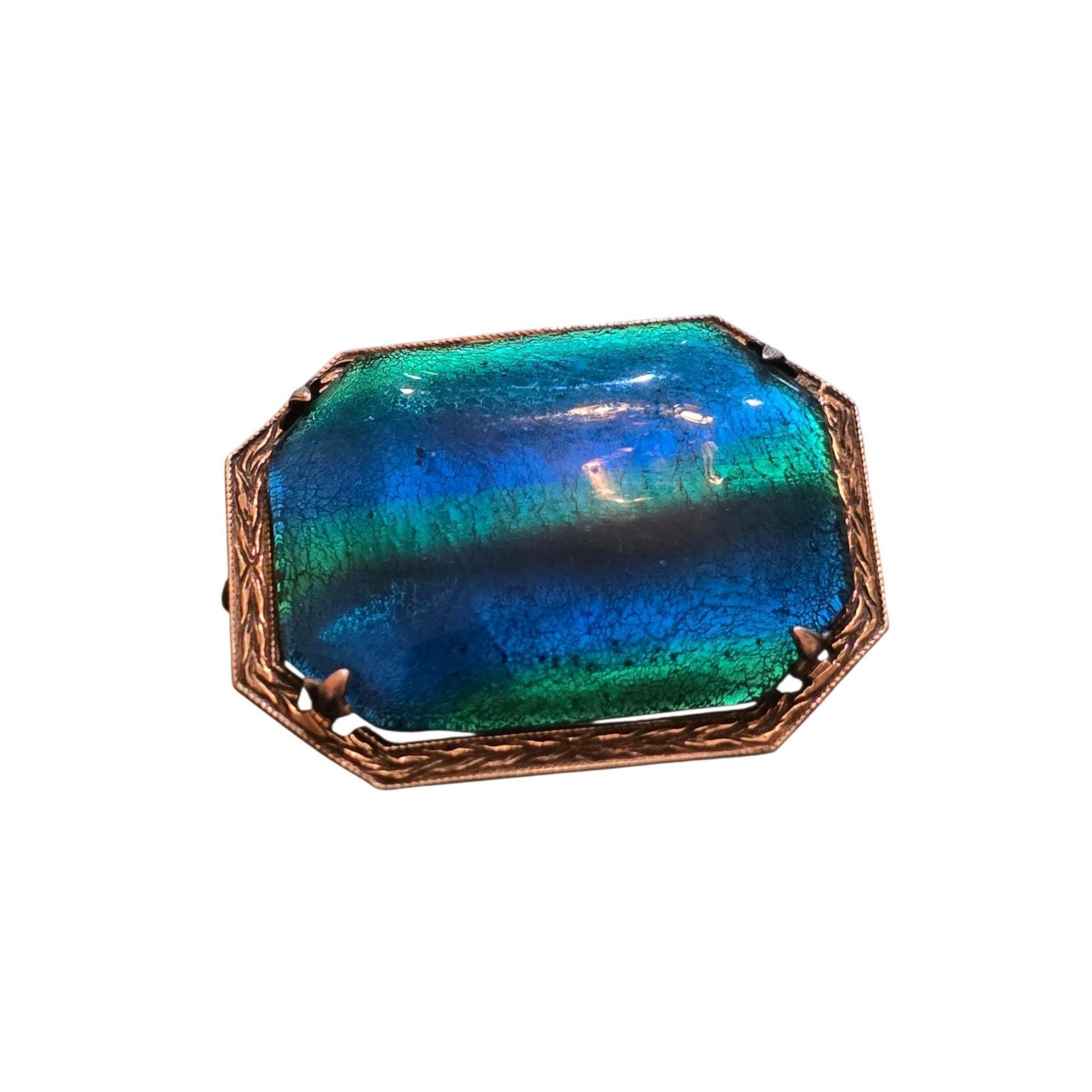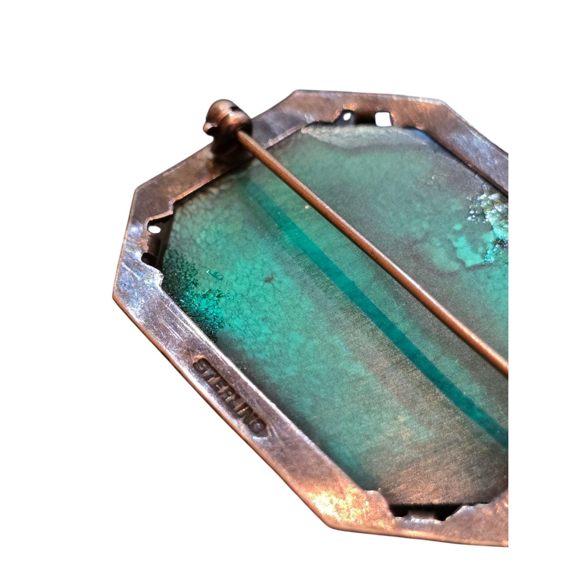 This antique brooch features vibrant peacock glass in shades of blue and green, set in sterling silver with intricate detailing, showcasing timeless craftsmanship.