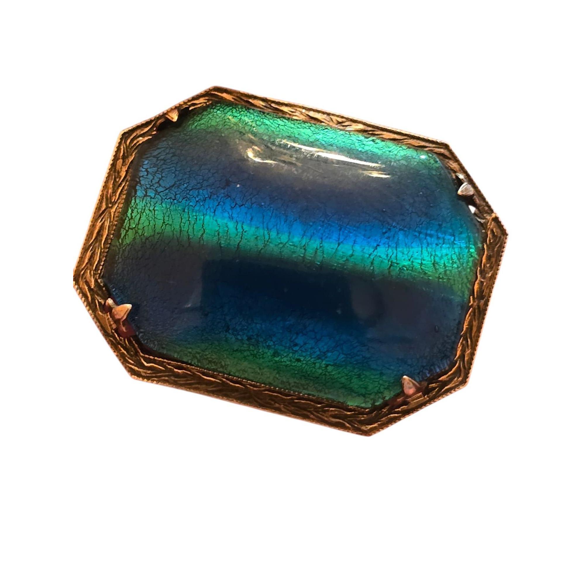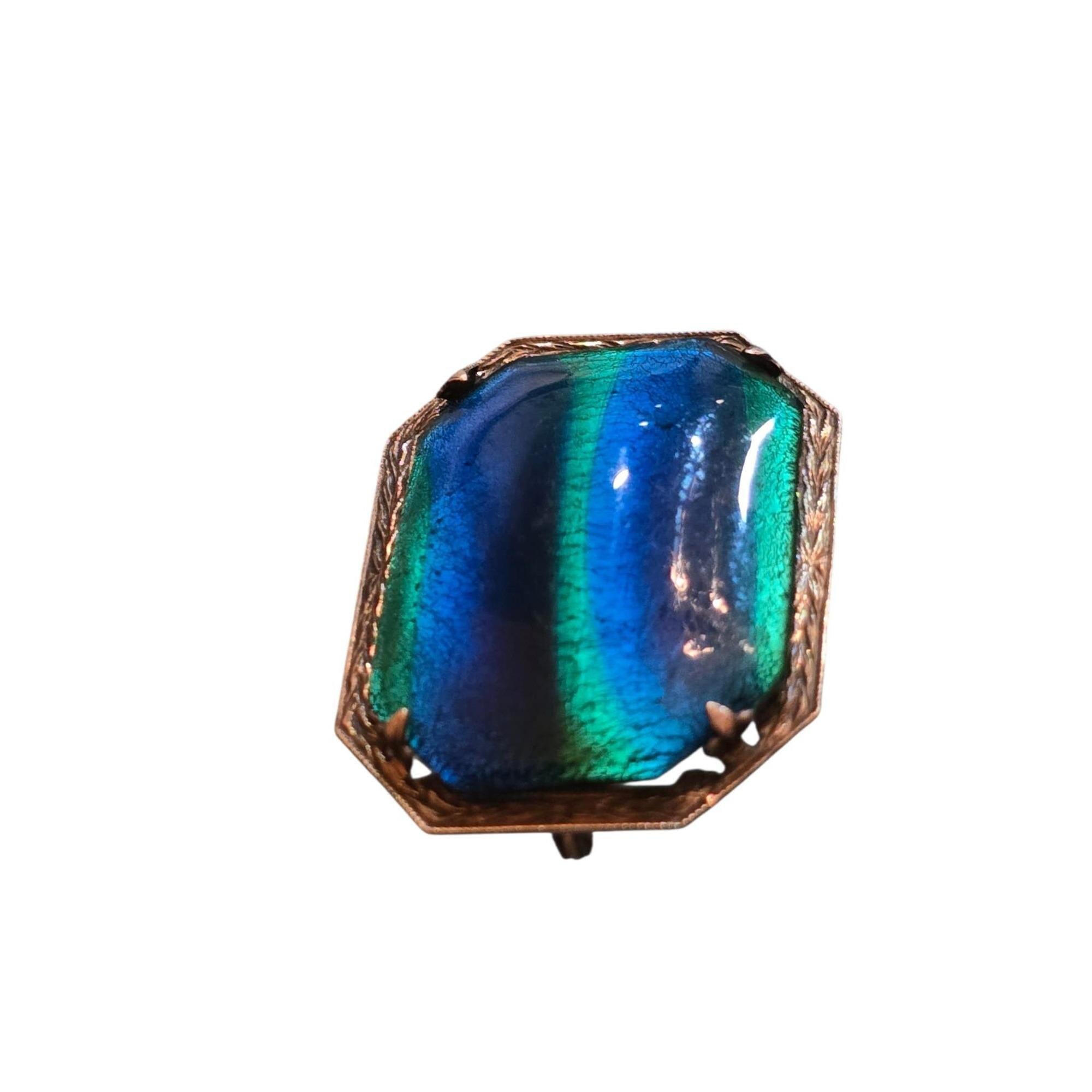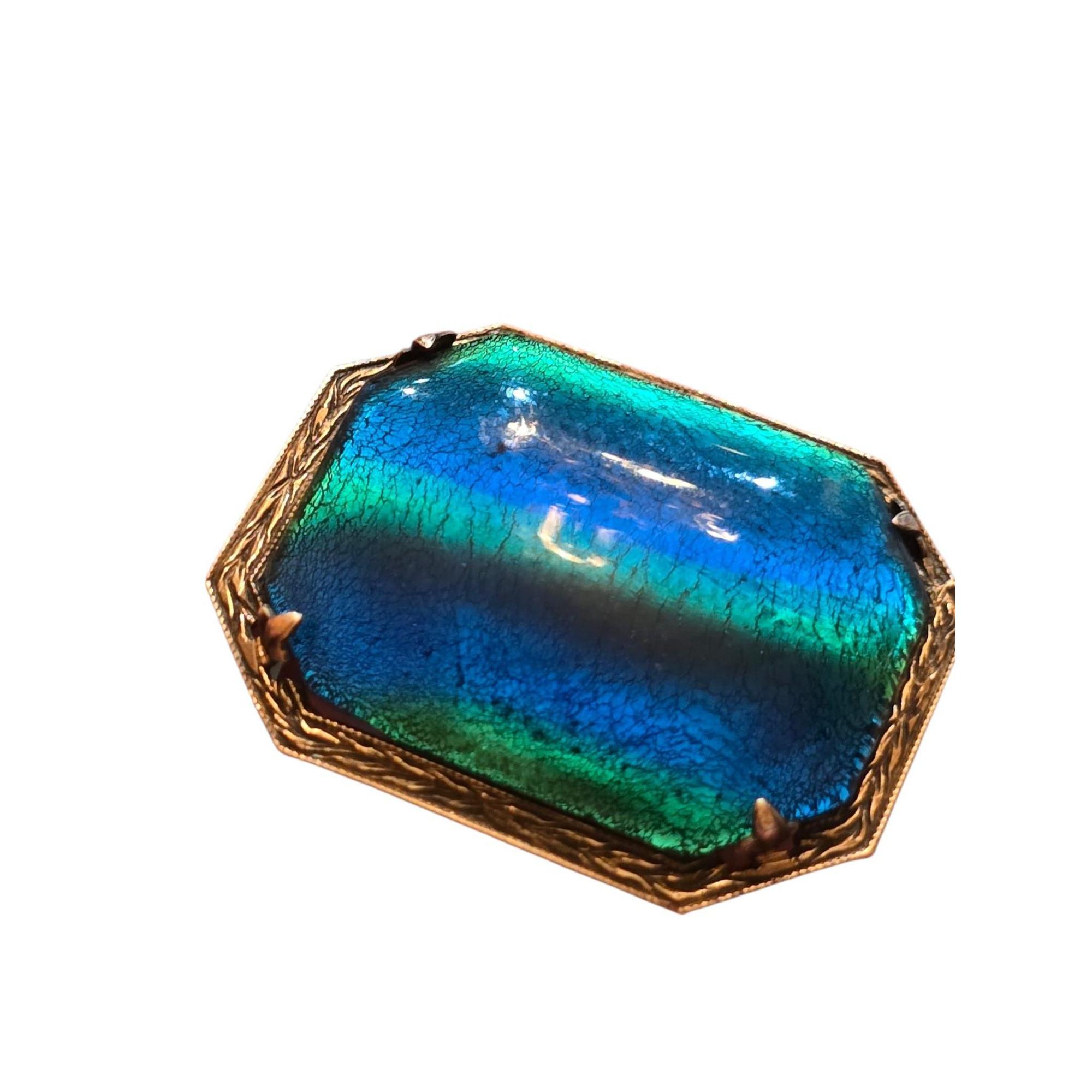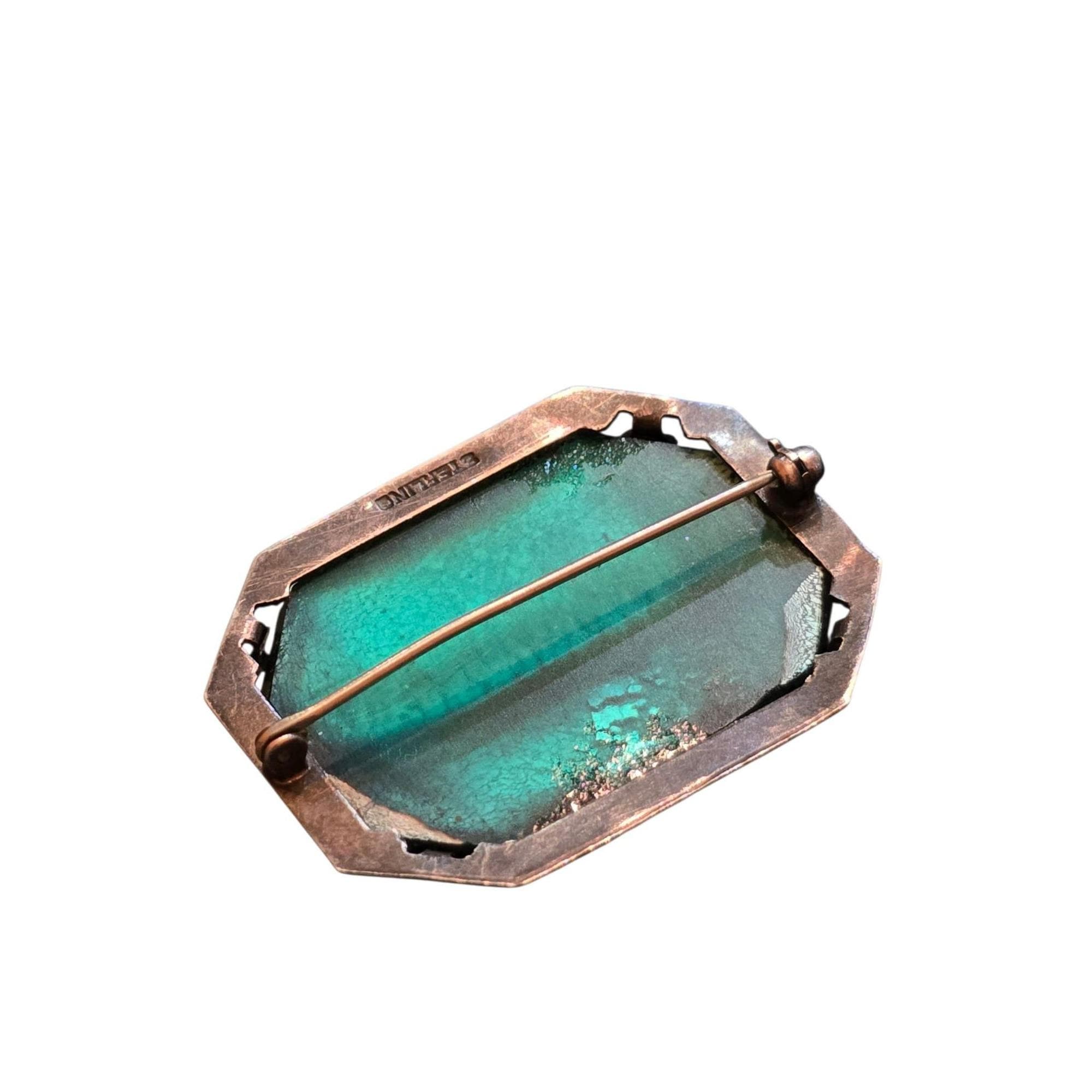 This antique brooch features vibrant peacock glass in shades of blue and green, set in sterling silver with intricate detailing, showcasing timeless craftsmanship.