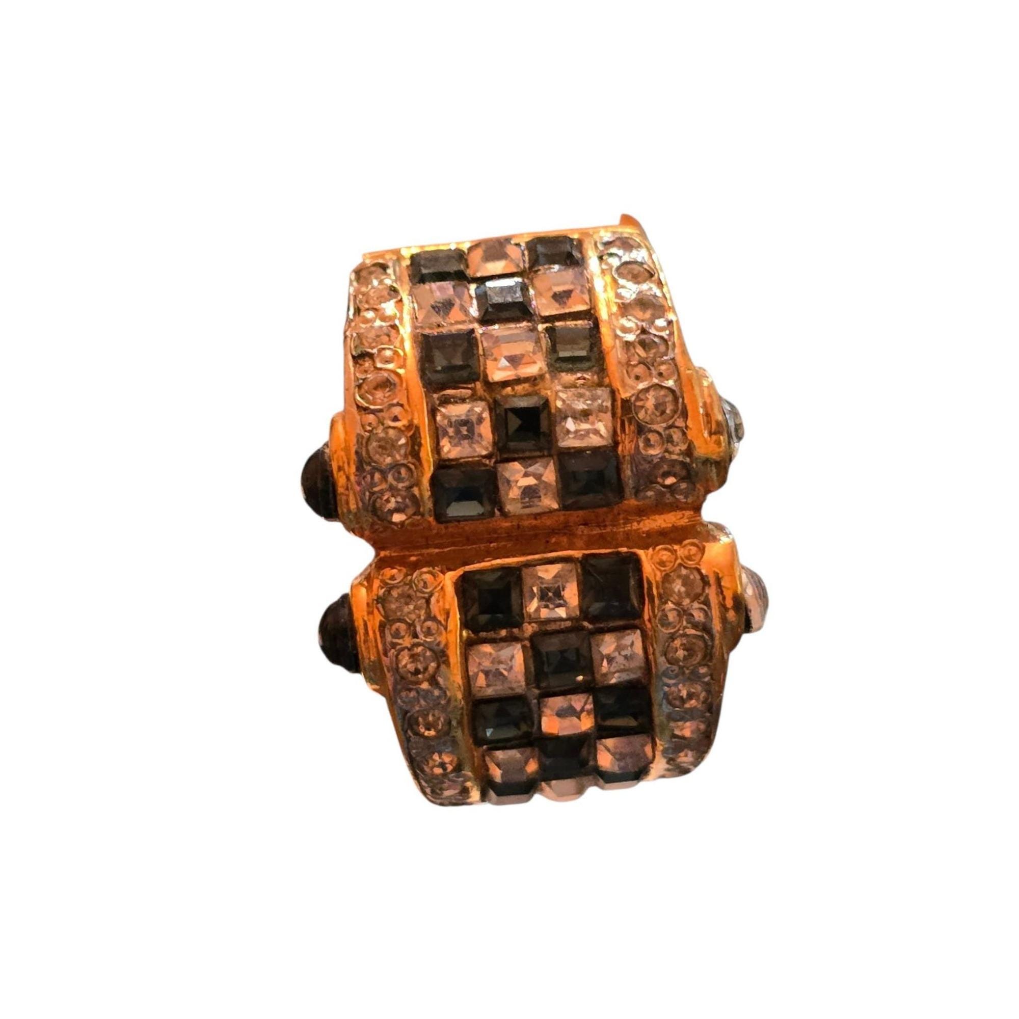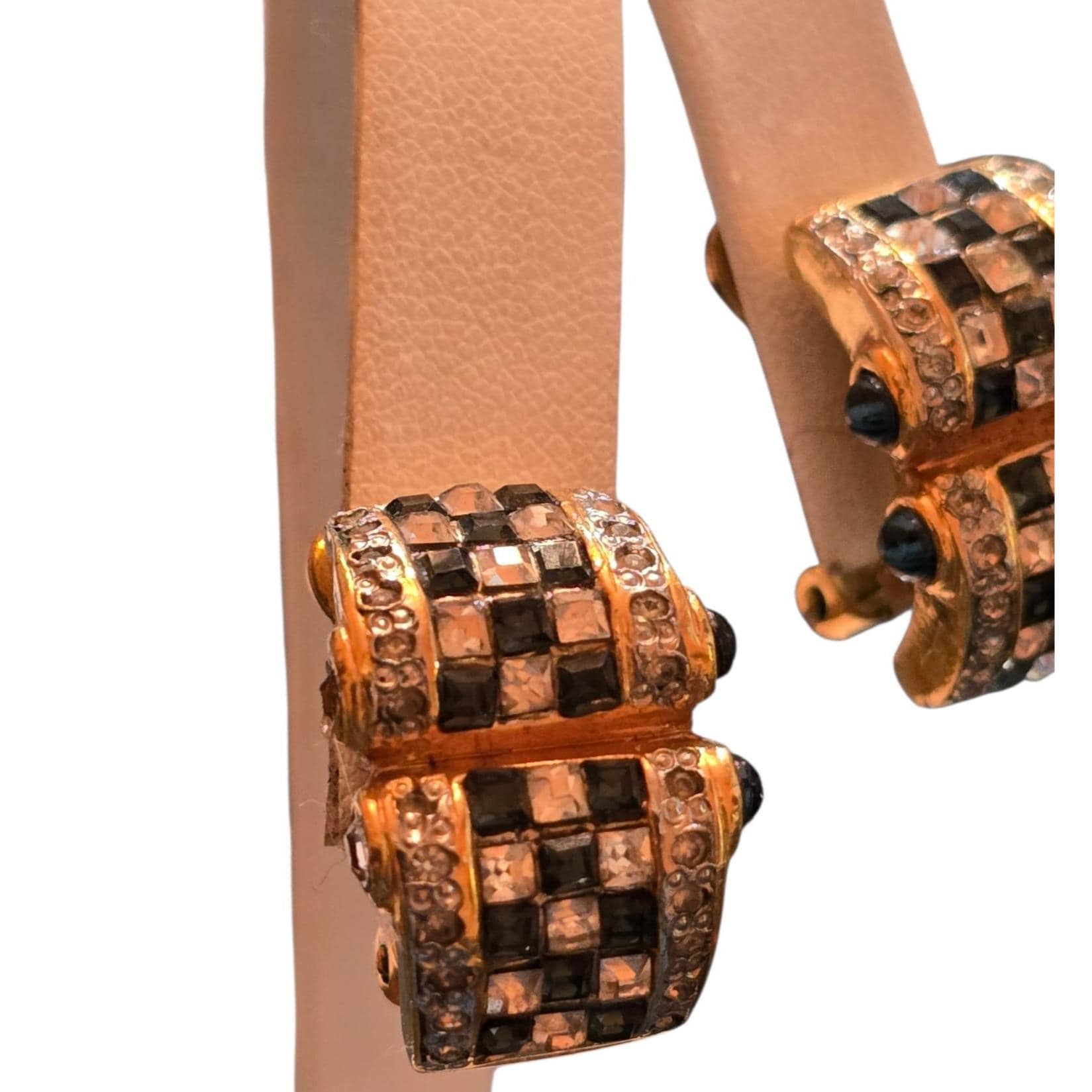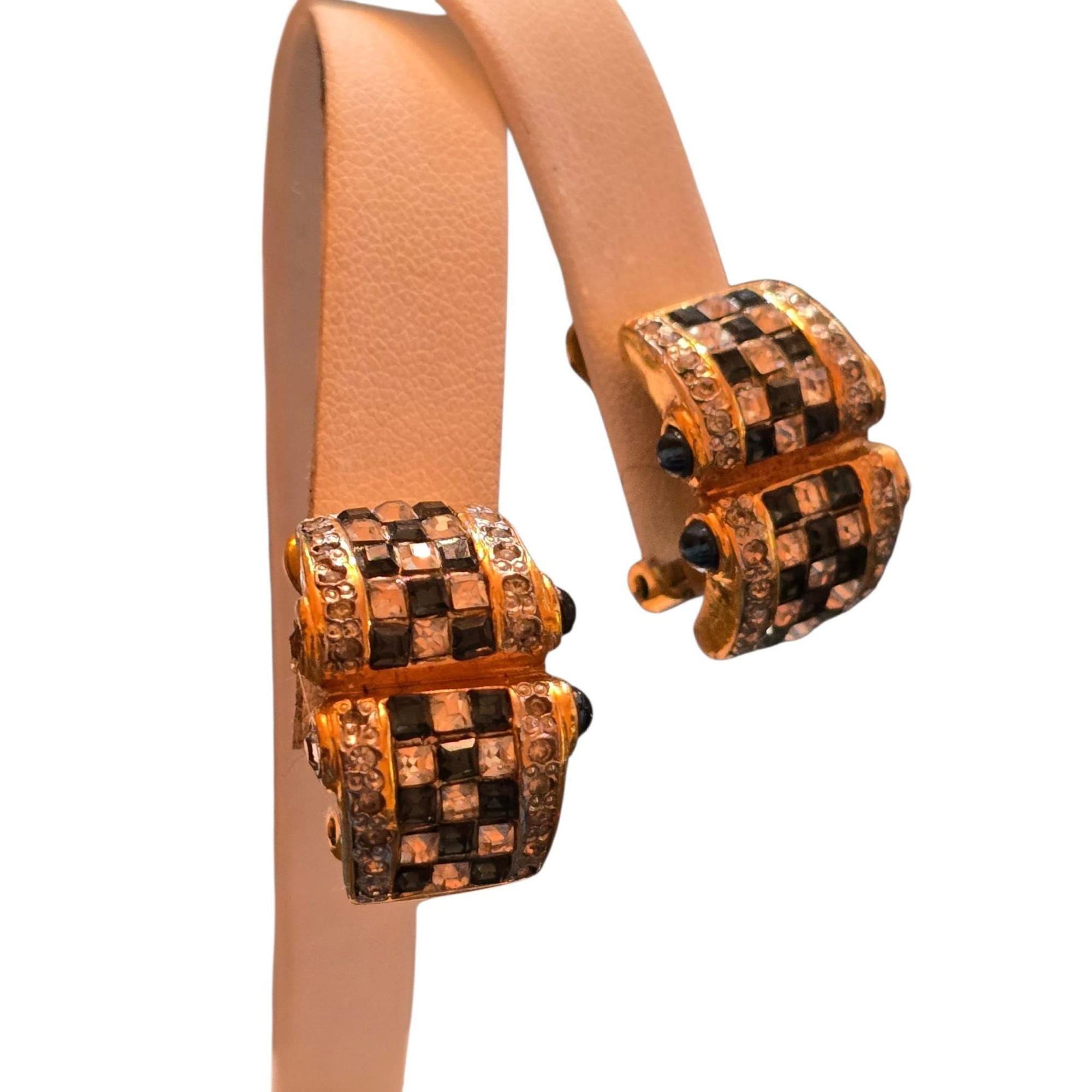 This pair of vintage Vogue Bijoux clip earrings features a striking checkerboard rhinestone design with a gold-tone finish. Signed backs affirm authenticity, and minor stone replacements do not detract from their timeless charm.