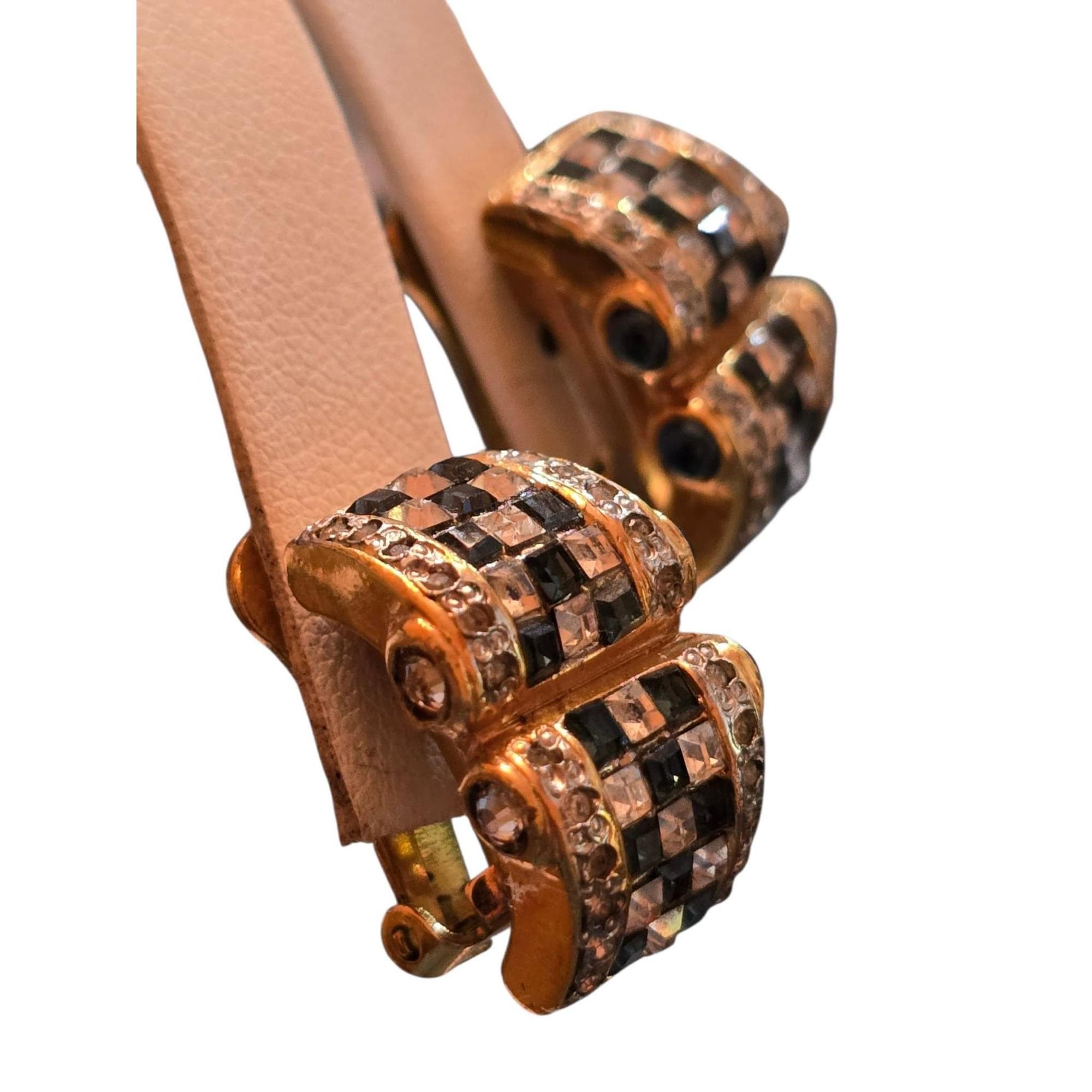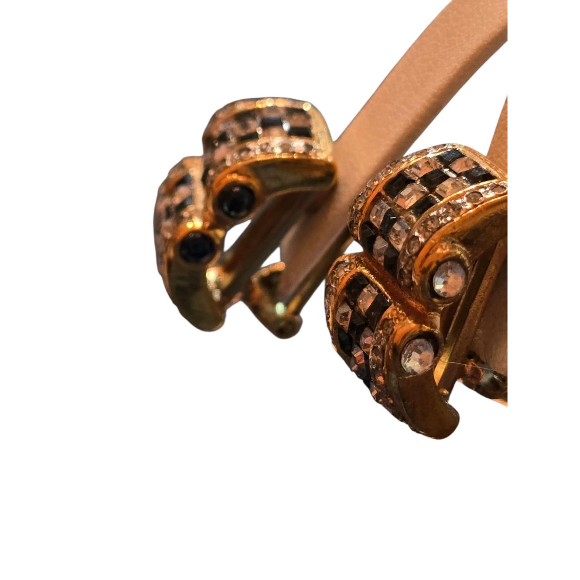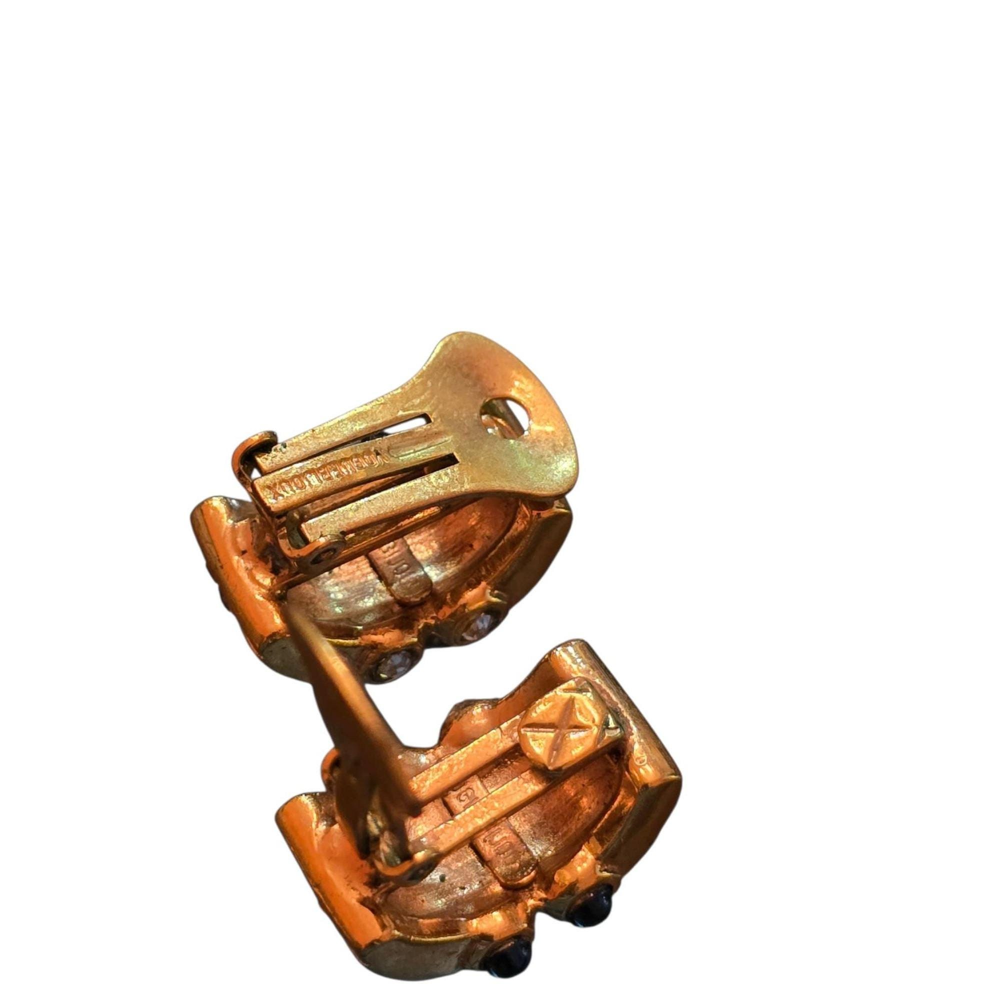 This pair of vintage Vogue Bijoux clip earrings features a striking checkerboard rhinestone design with a gold-tone finish. Signed backs affirm authenticity, and minor stone replacements do not detract from their timeless charm.