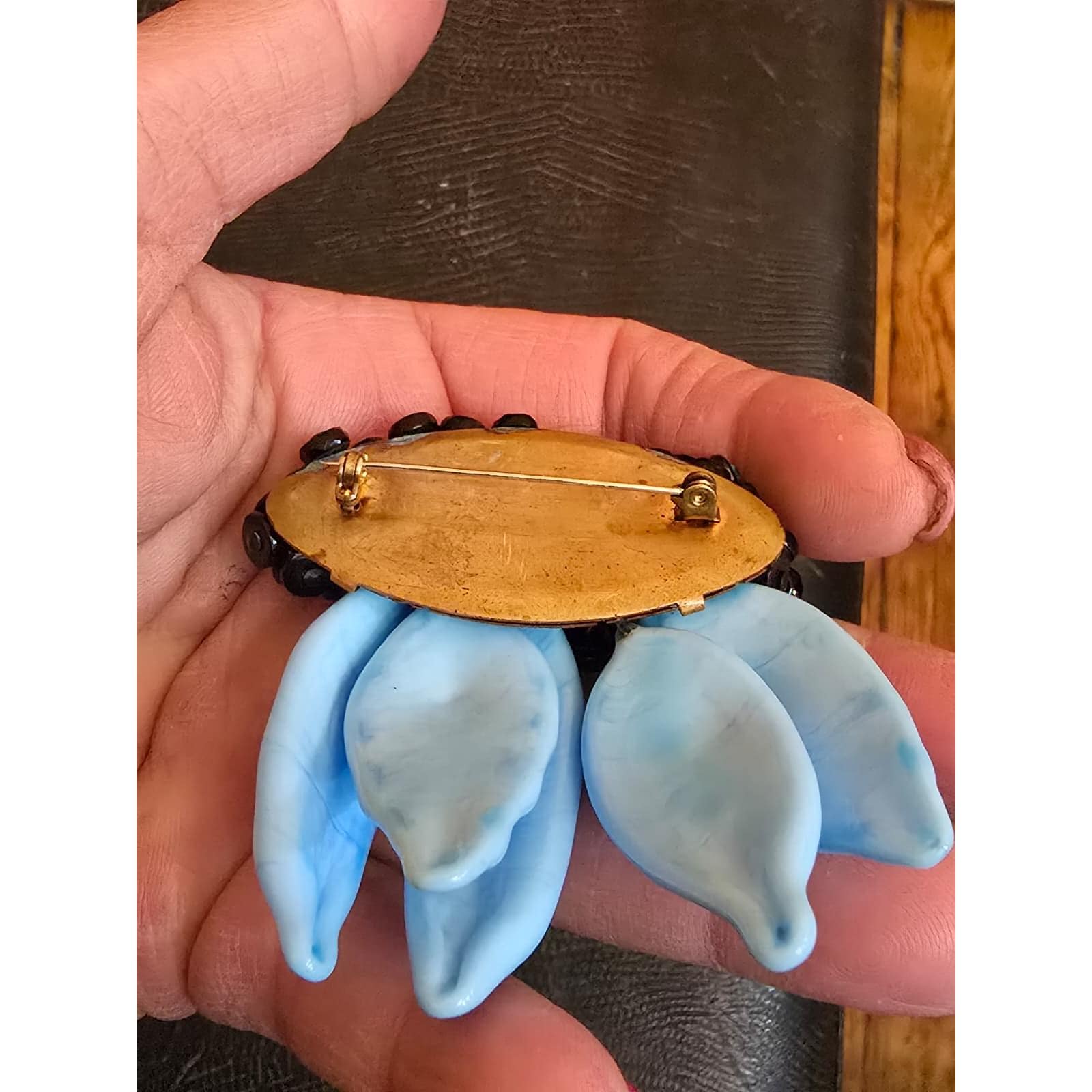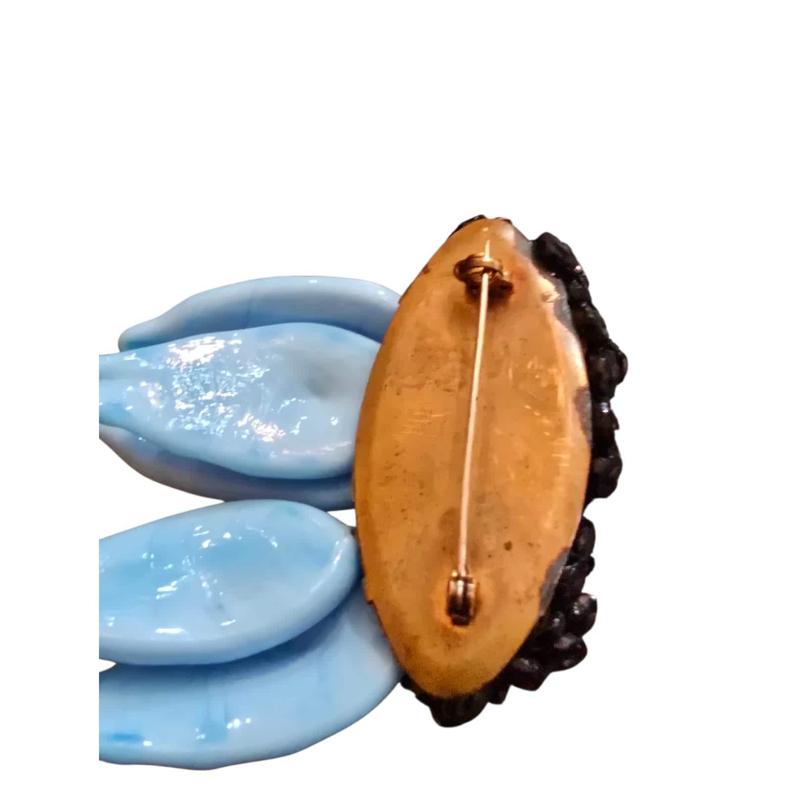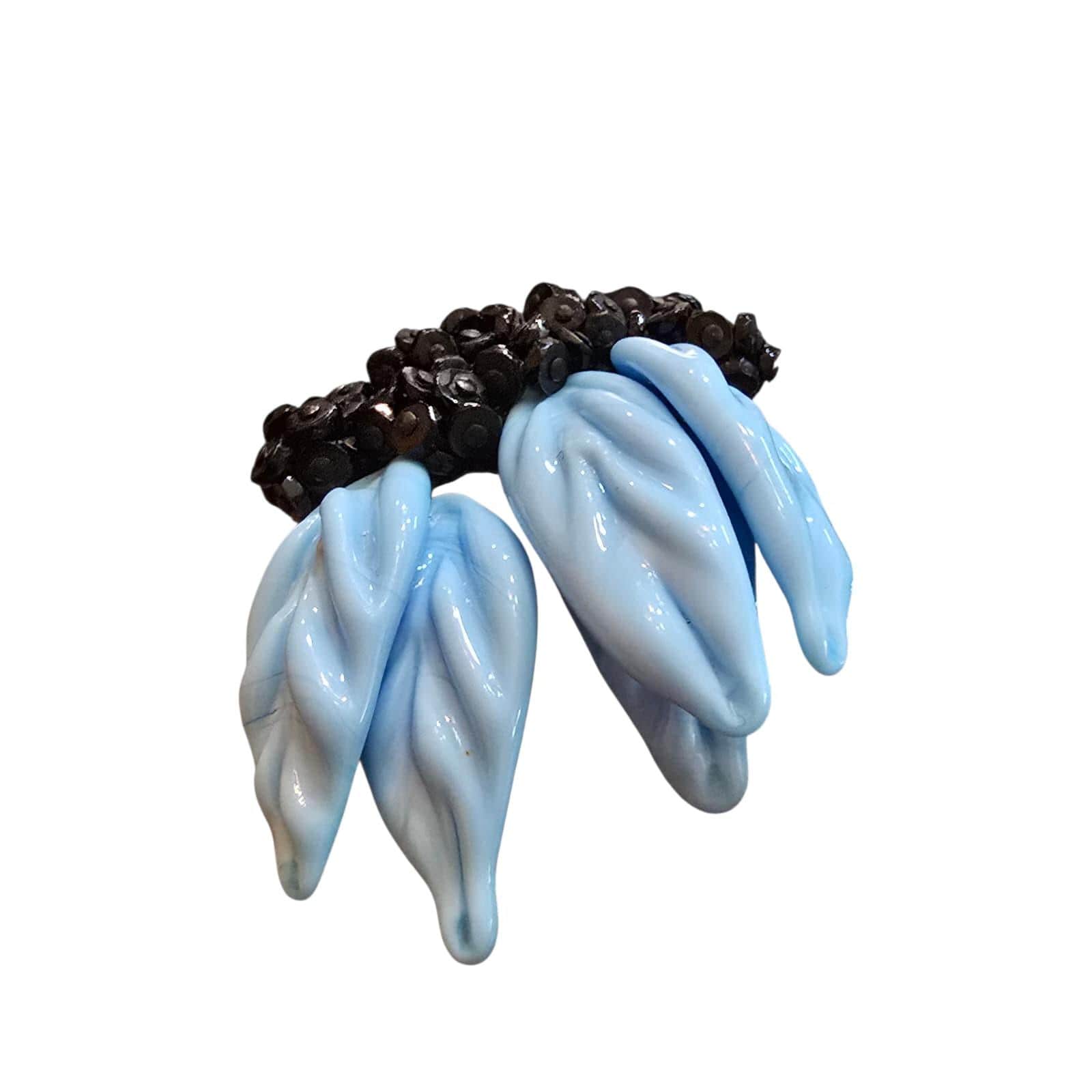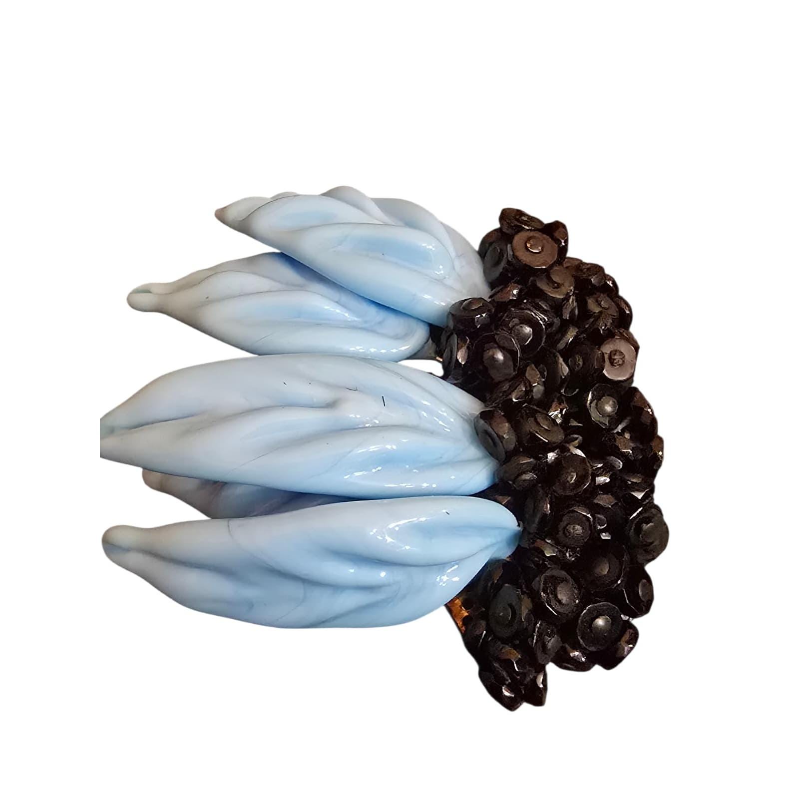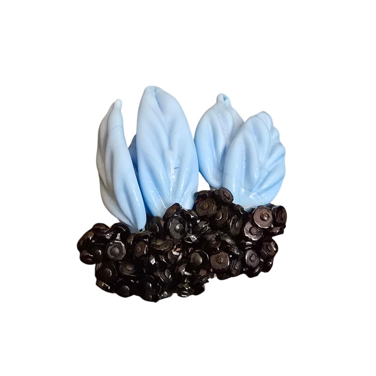 Beautiful molded glass. Has 5 large (1.5") glass or porcelain bright blue detailed leaves.